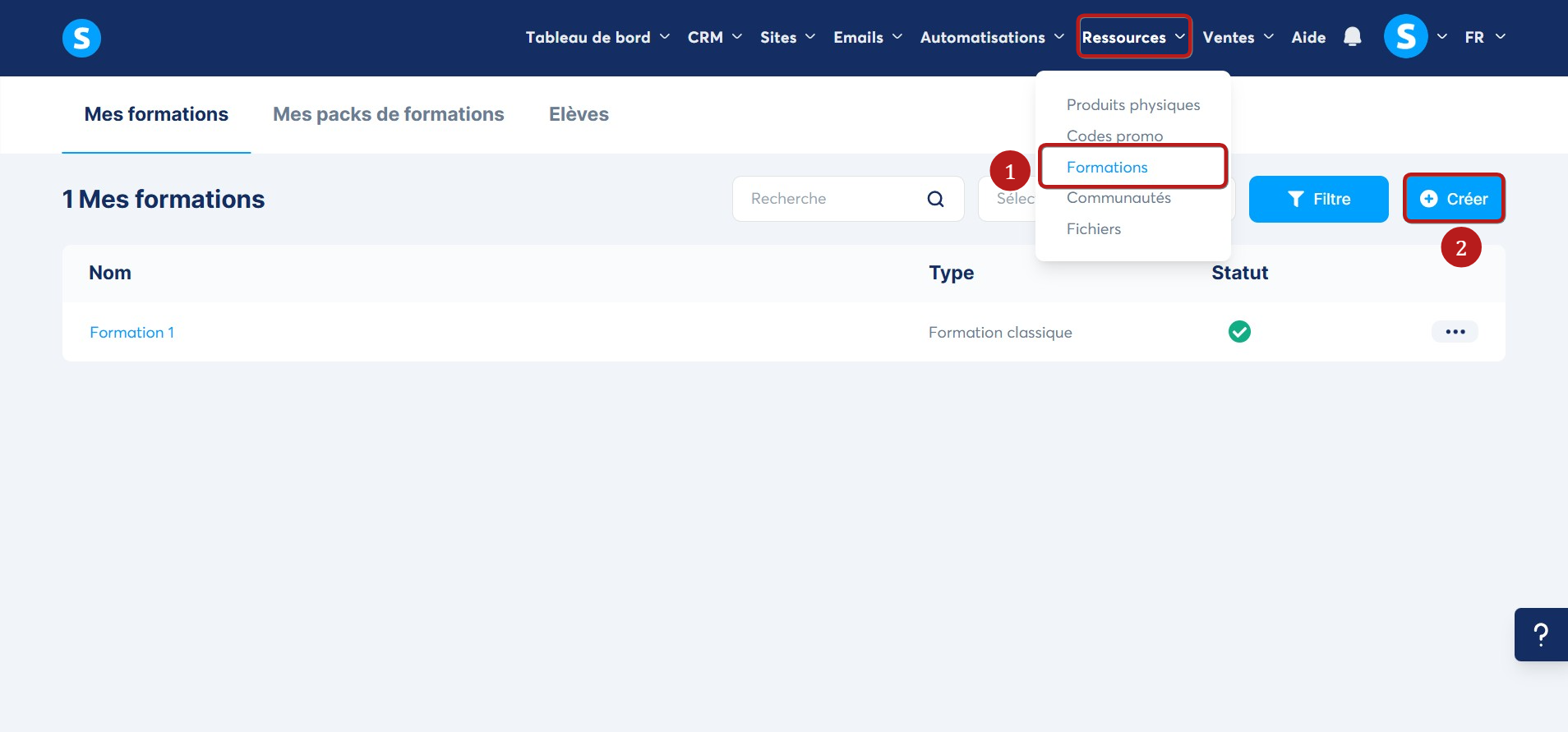 Allez dans le Menu >> Ressources >> Formations (1), puis cliquez sur Créer pour créer une nouvelle formation (2).