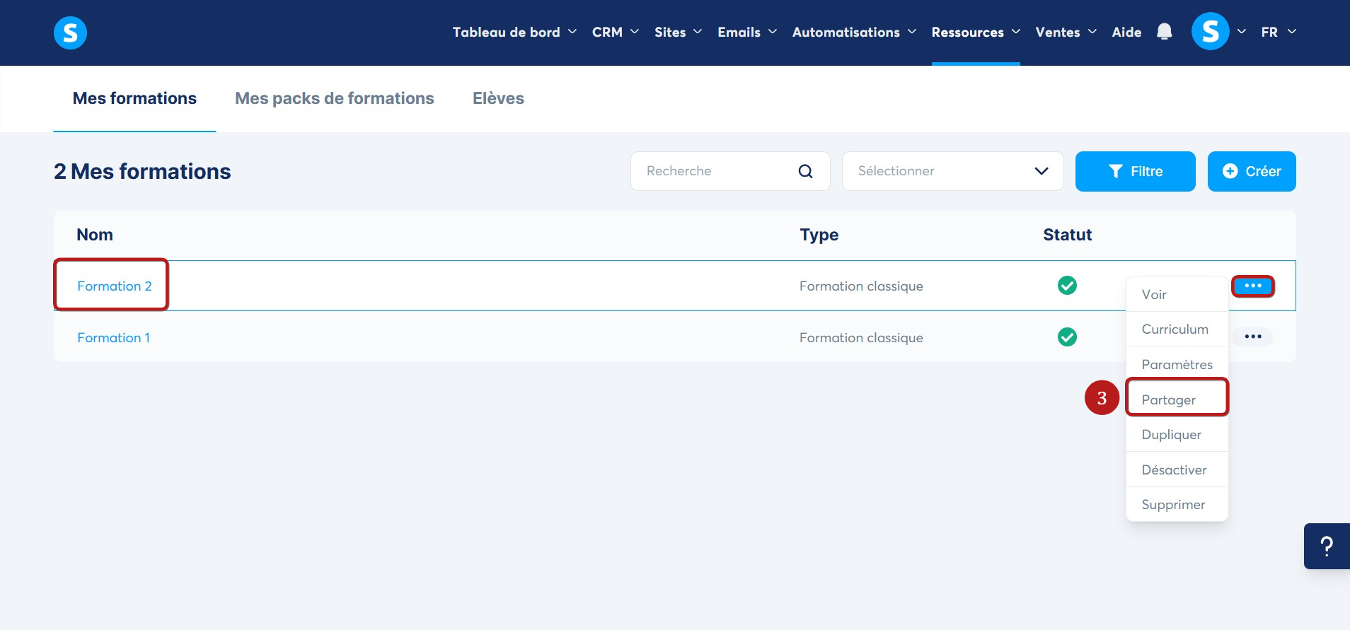 Une fois la formation créée, il faut cliquer sur Partager après avoir cliqué sur les 3 points (3).