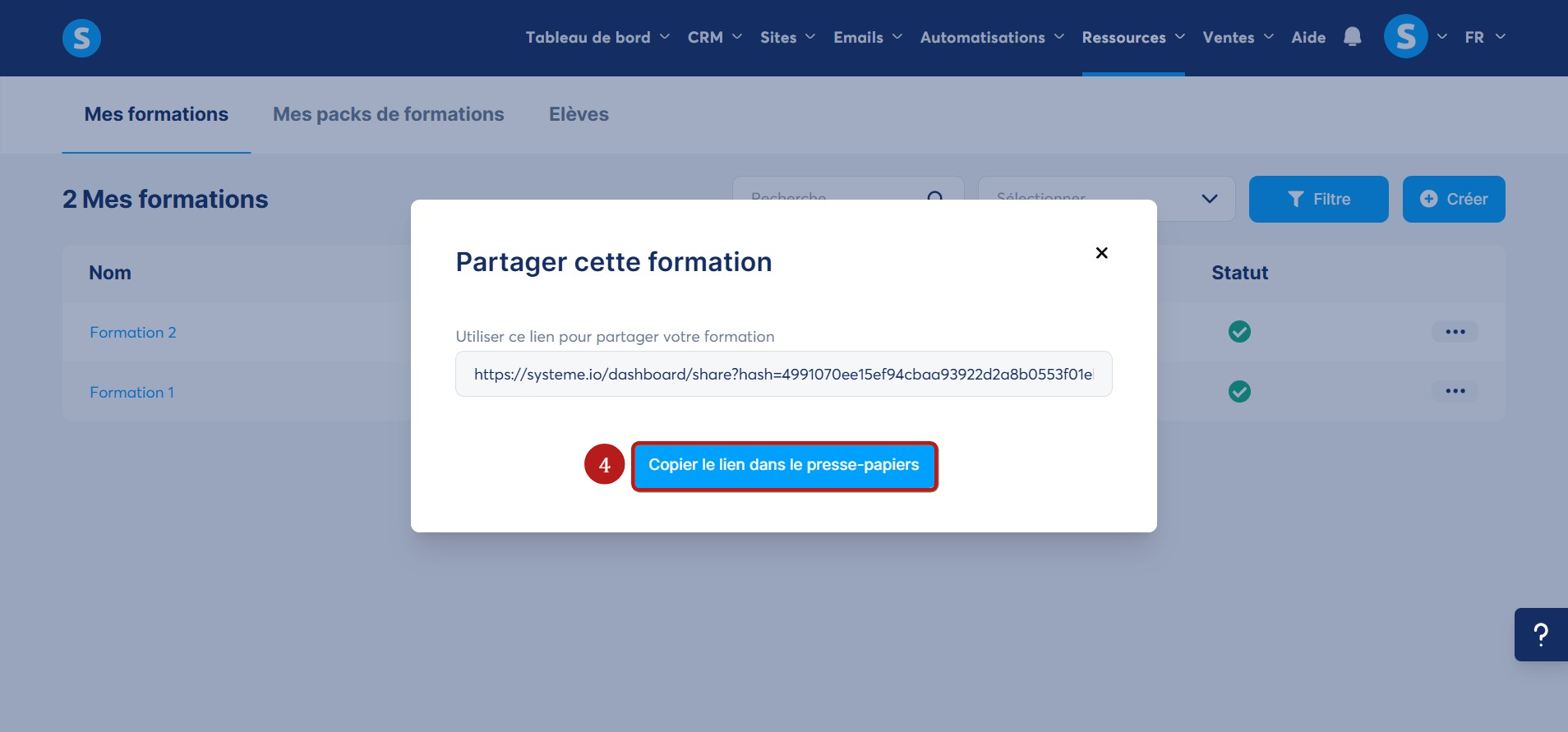 Une popup s’affichera avec l’URL de la formation partagée et un bouton qui permet de copier le lien à partager avec d’autres utilisateurs de systeme.io (4).