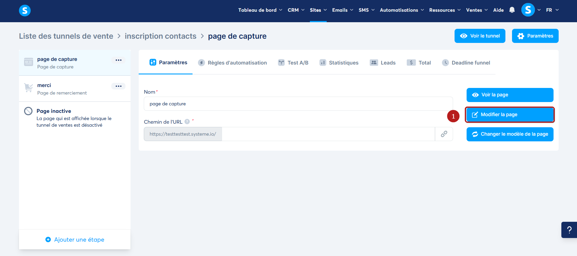 Accédez à l'éditeur de votre page en cliquant sur "Modifier la page" (1).
