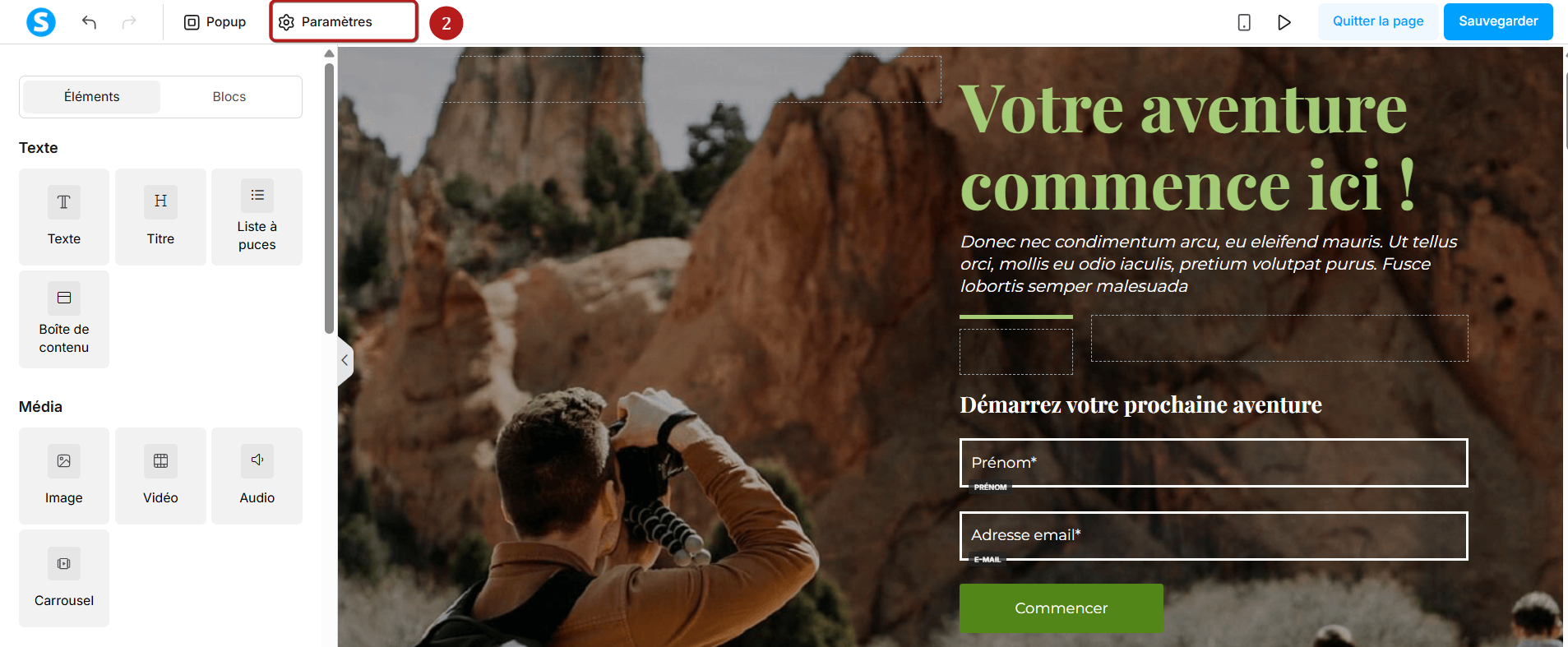 Puis cliquez sur le bouton "Paramètres" pour accéder aux paramètres de votre page (2).