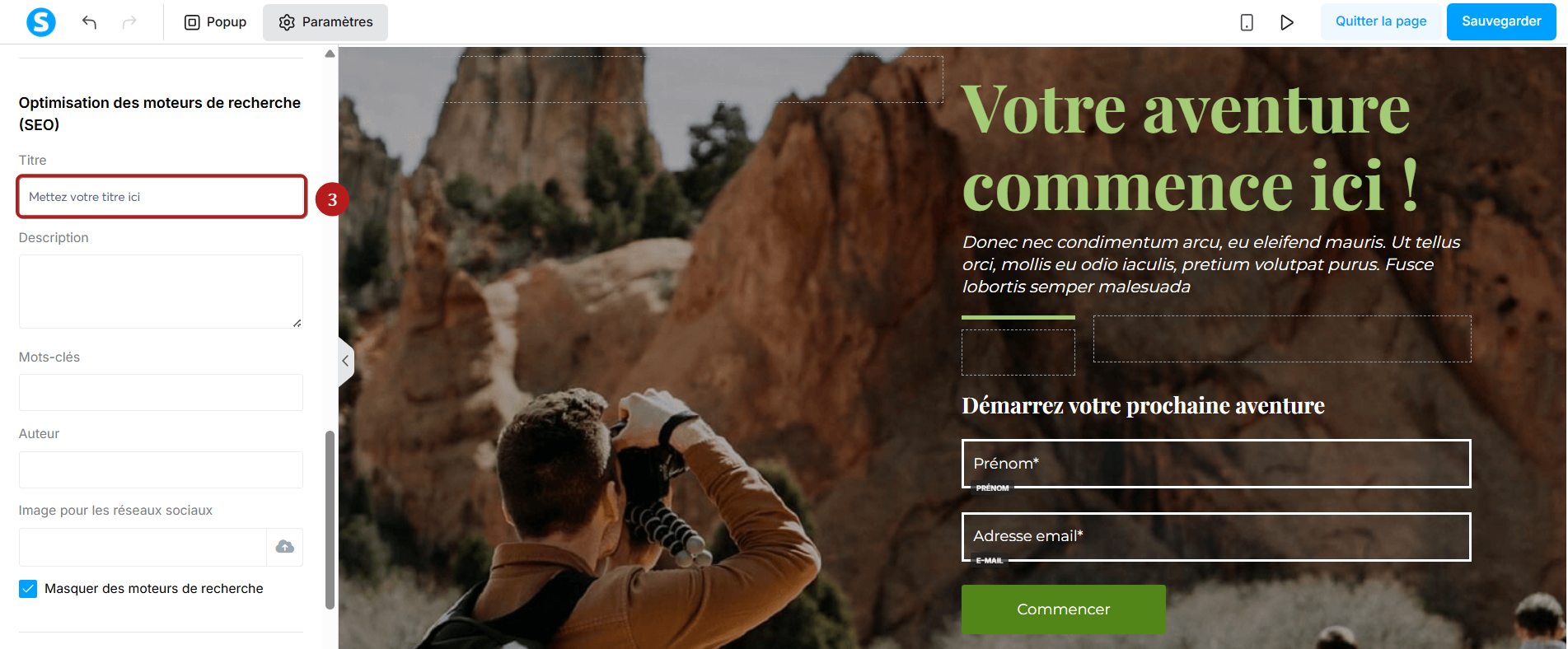 Faites défiler le menu latéral jusqu'à la section "Optimisation des moteurs de recherche (SEO)" et saisissez le titre de votre choix dans le champ "Titre" (3).