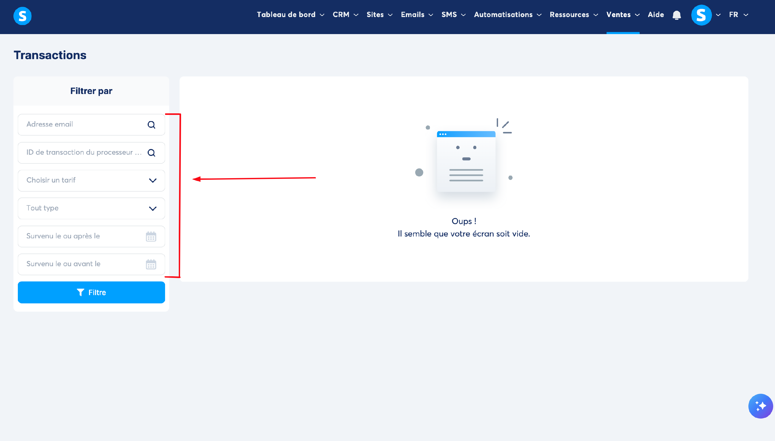 2. Une fois sur l'interface de transaction, vous remarquerez un tableau à votre gauche. Ce tableau est composé de plusieurs filtres :