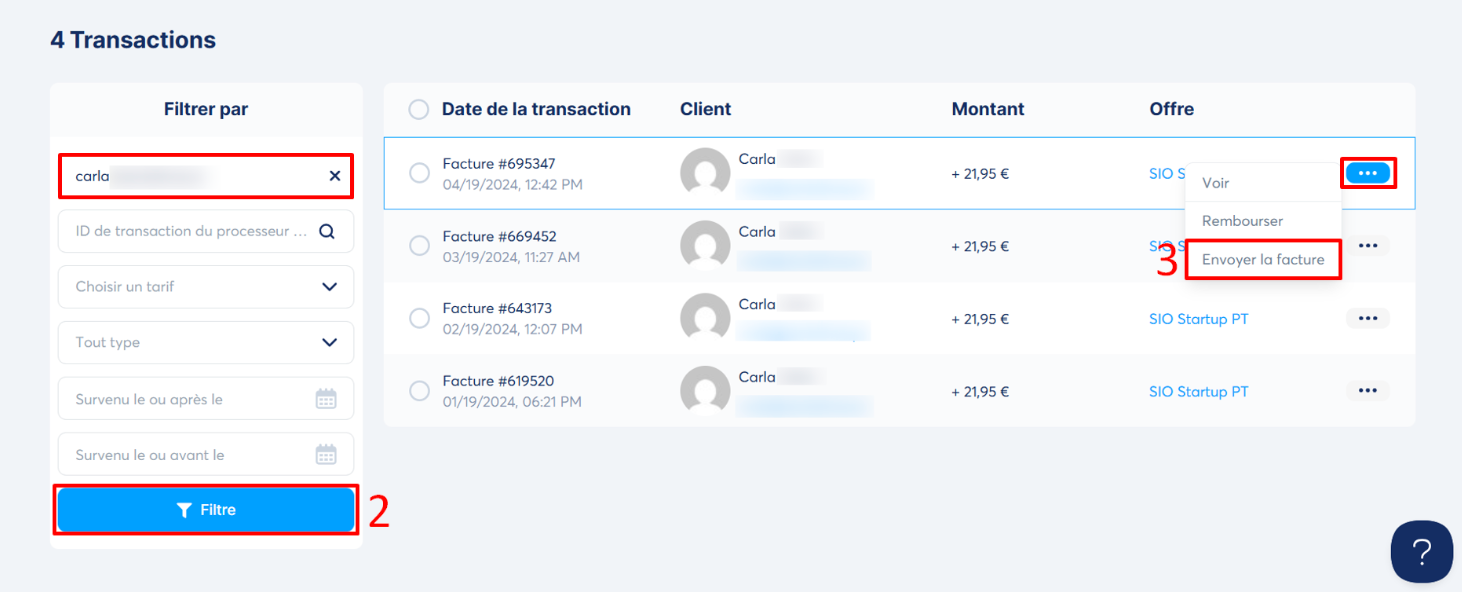 3. Lorsque vous aurez introduit l'email et filtrer sur les transactions (numéro 2 sur l'image), les informations de ce dernier apparaitront dans le cadre à droite.