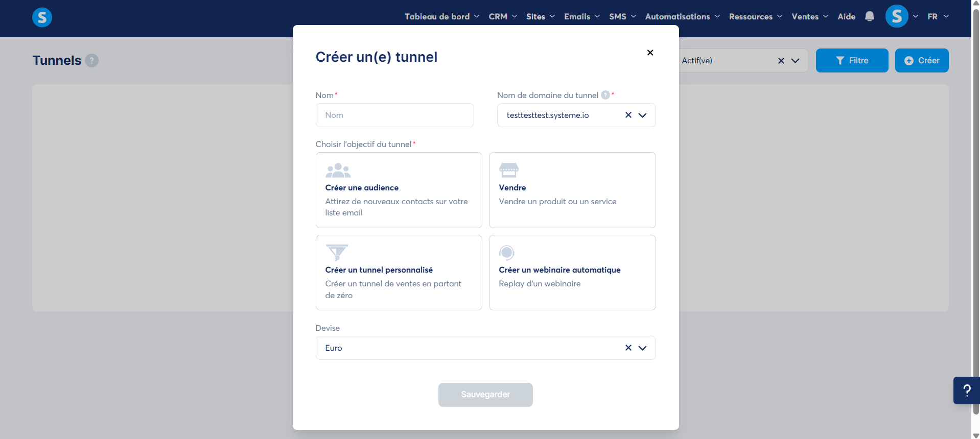 Il y a actuellement 4 possibilités au choix lors de la création d'un tunnel de vente :