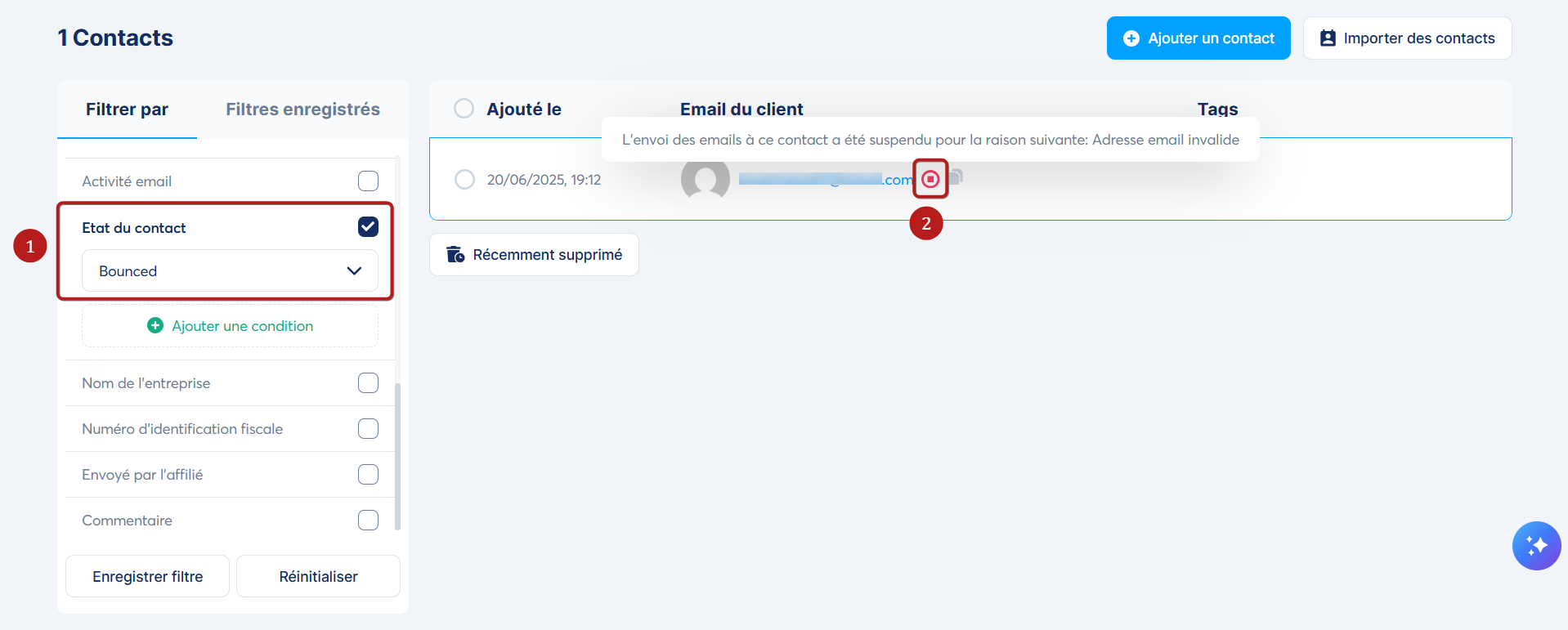 Vous pouvez également les retrouver en filtrant votre liste avec l'option "État du contact" (1).