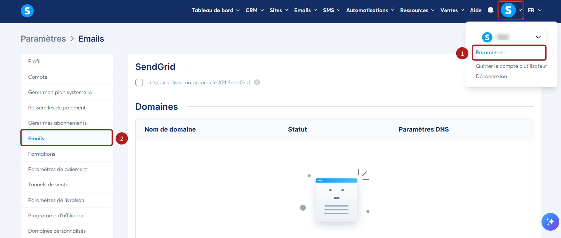 Accédez au menu en cliquant sur votre photo de profil, puis sur "Paramètres" (1), et sélectionnez "Emails" (2).