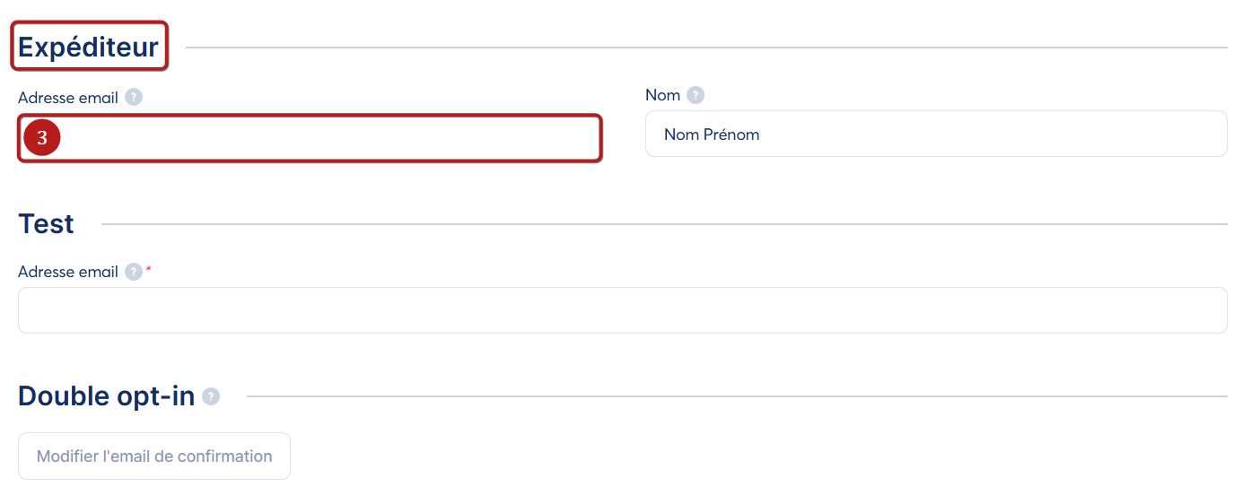 Dans le champ "Adresse email" au niveau de la section "Expéditeur", entrez l'adresse email que vous souhaitez faire apparaître sur vos emails (3).
