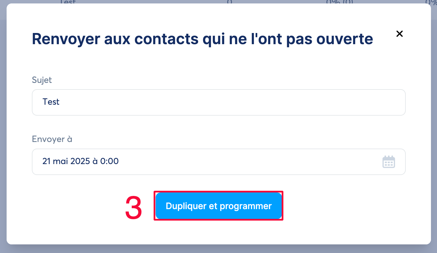 Enfin, vous n'aurez qu’à changer le titre du sujet ou garder le même titre, ensuite programmer une date à laquelle vous voulez renvoyer la newsletter à ceux ne l'ayant pas ouvert. Il ne vous restera ensuite qu'à cliquer sur « Dupliquer et programmer » (numéro 3 sur l’image)