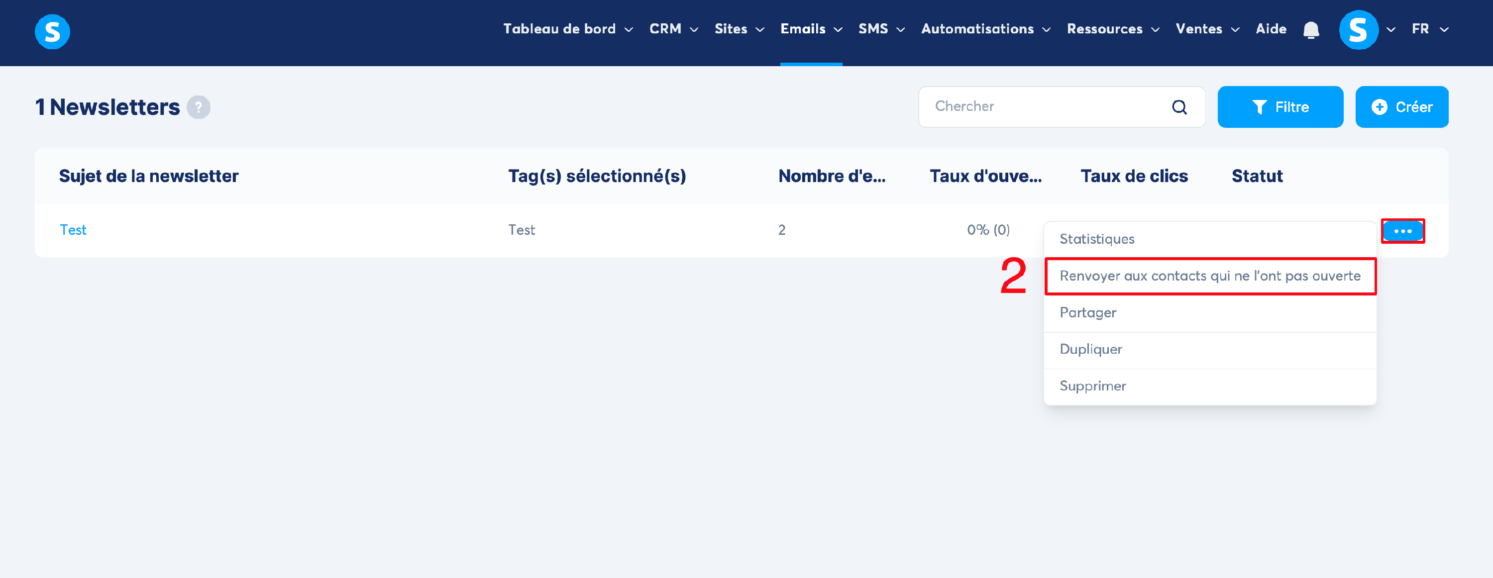 Dirigez-vous ensuite vers la newsletter en question, cliquez sur les 3 points, ensuite sur "Renvoyer aux contacts qui ne l'ont pas ouverte" (numéro 2 sur l’image).