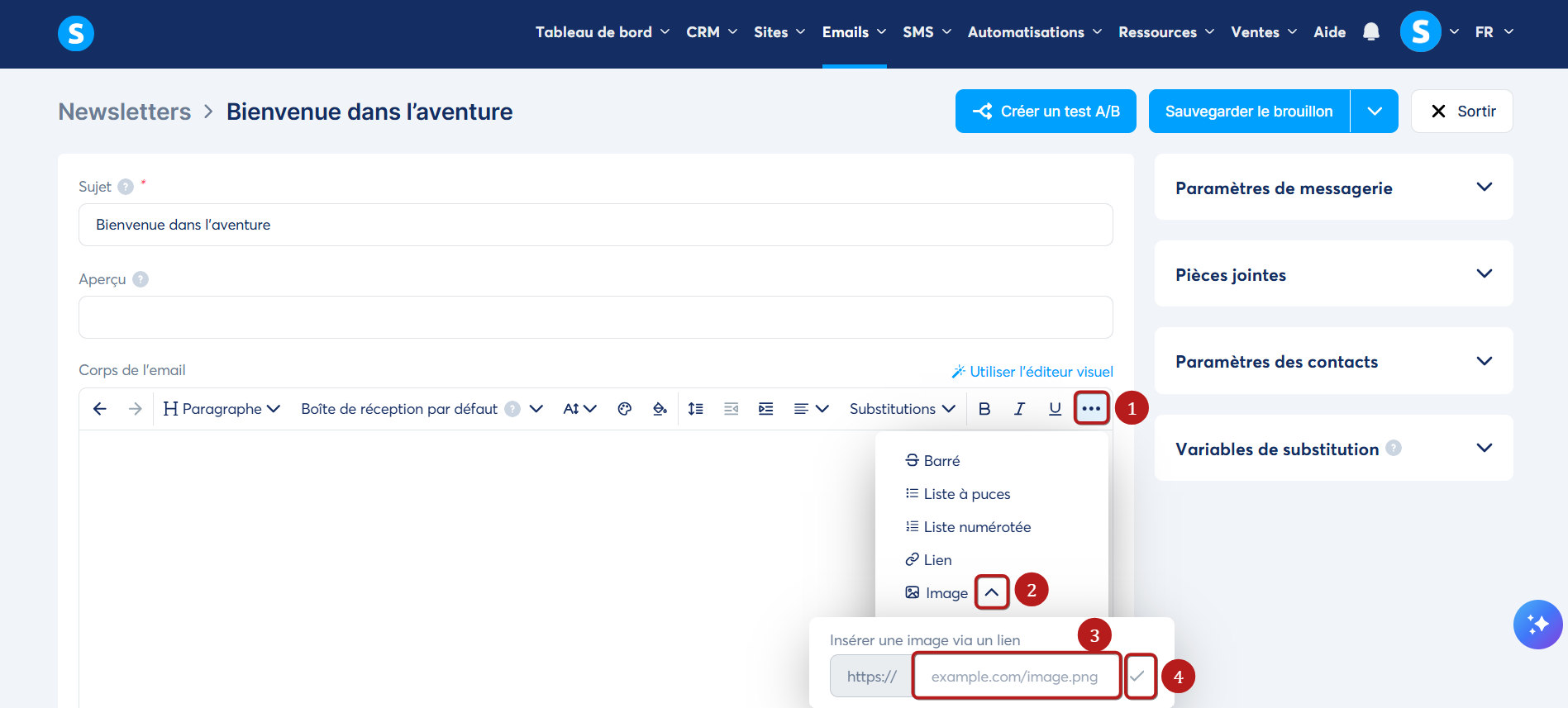 Ensuite, dans votre email, cliquez sur les trois points (1), puis sur la flèche (2). Une fenêtre s'ouvrira contenant le champ "Insérez une image via un lien". Collez-y l'URL de votre image (3), puis cliquez sur l'icône (4) pour valider.