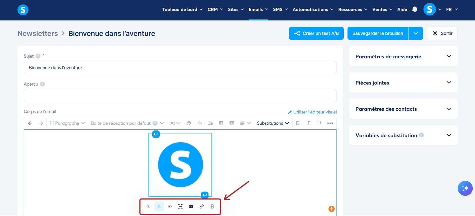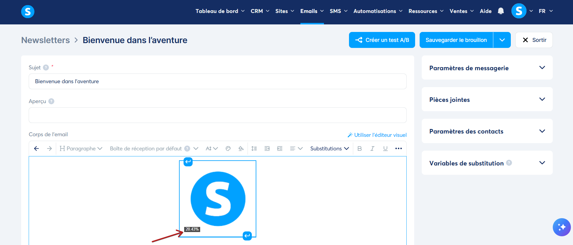 Une fois votre image chargée, celle-ci s'ajoutera automatiquement au niveau de votre email, puis par la suite, vous pouvez :