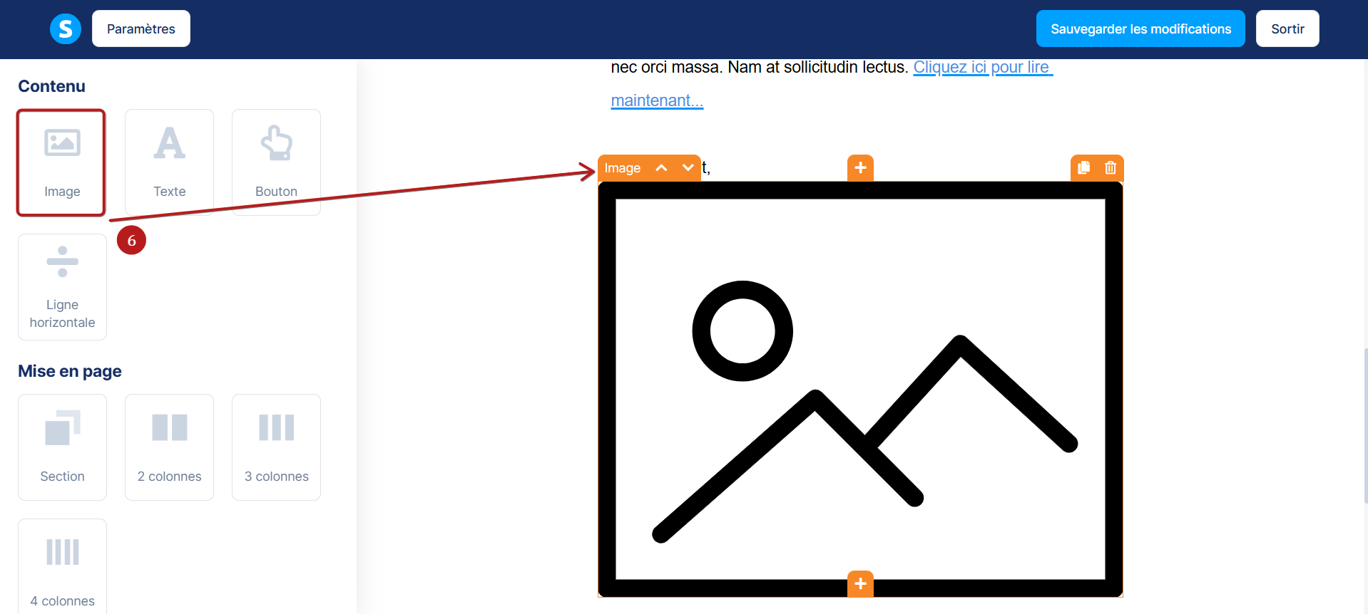 Une fois sur l'éditeur visuel de votre email, il vous suffit de glisser-déposer l'élément "Image" sur le contenu de l'éditeur de votre page (6).