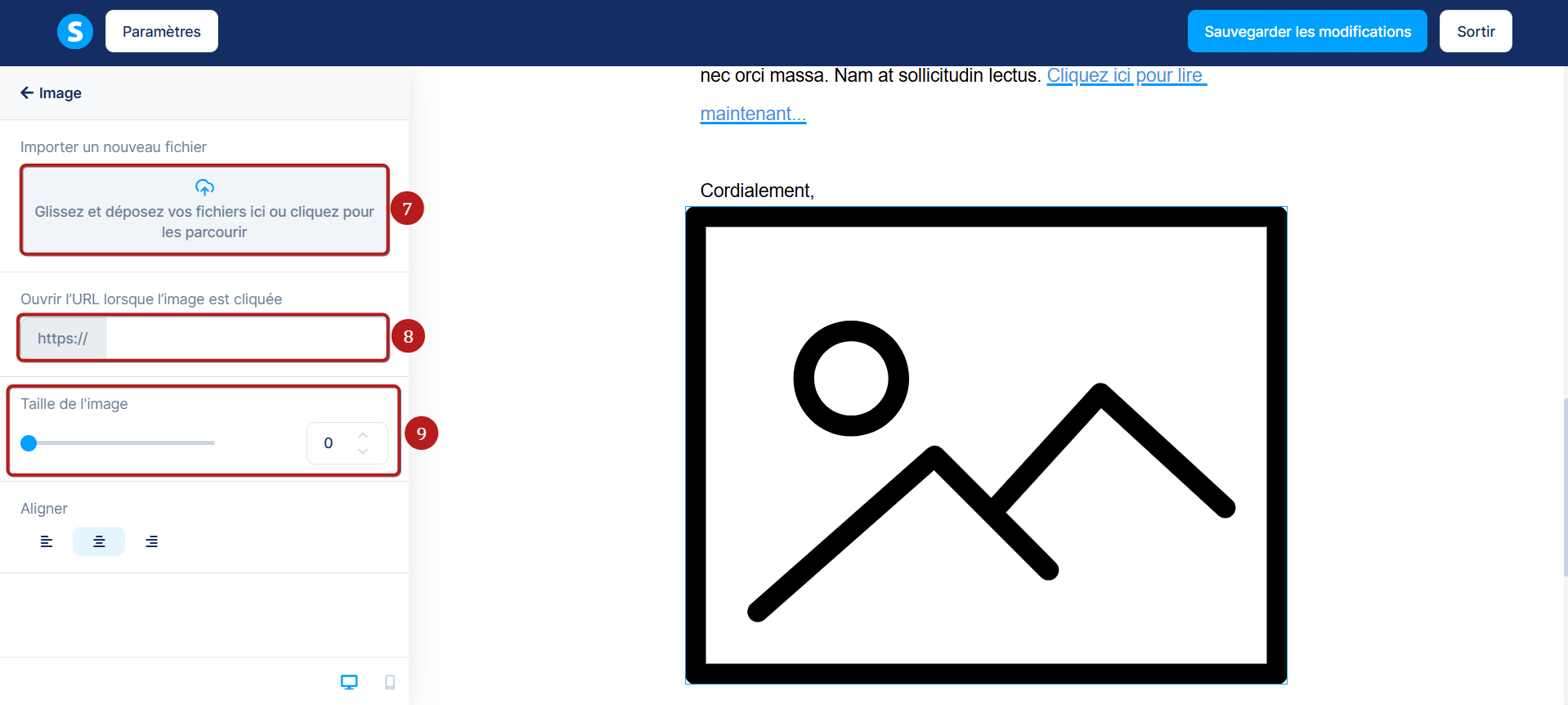 - Changer l’alignement de l’image : alignée à droite, centrée ou alignée à gauche.