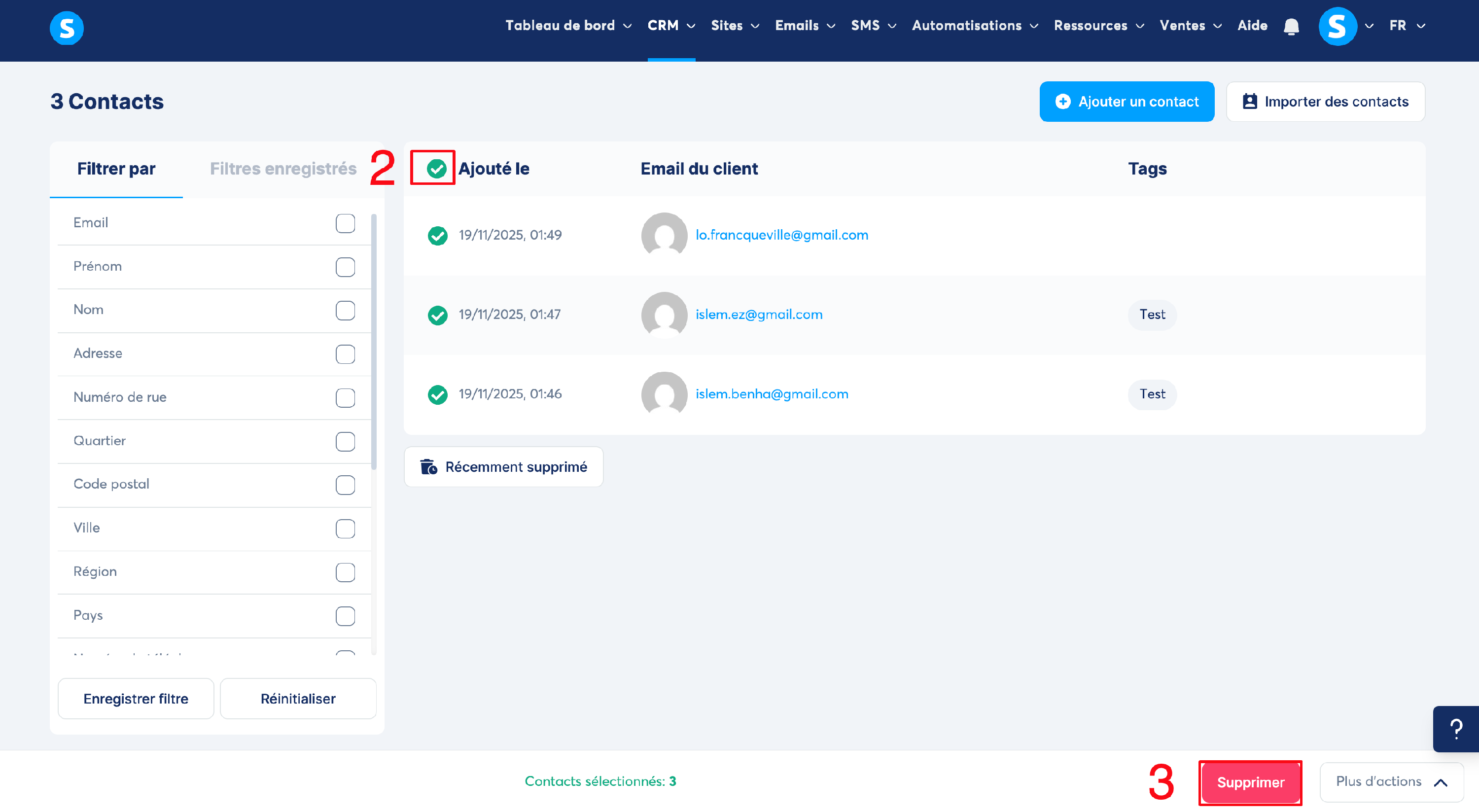 Ensuite, cliquez sur le bouton (numéro 2 sur l'image) pour sélectionner toute votre liste de contacts, puis cliquez sur "Supprimer". (numéro 3 sur l'image)