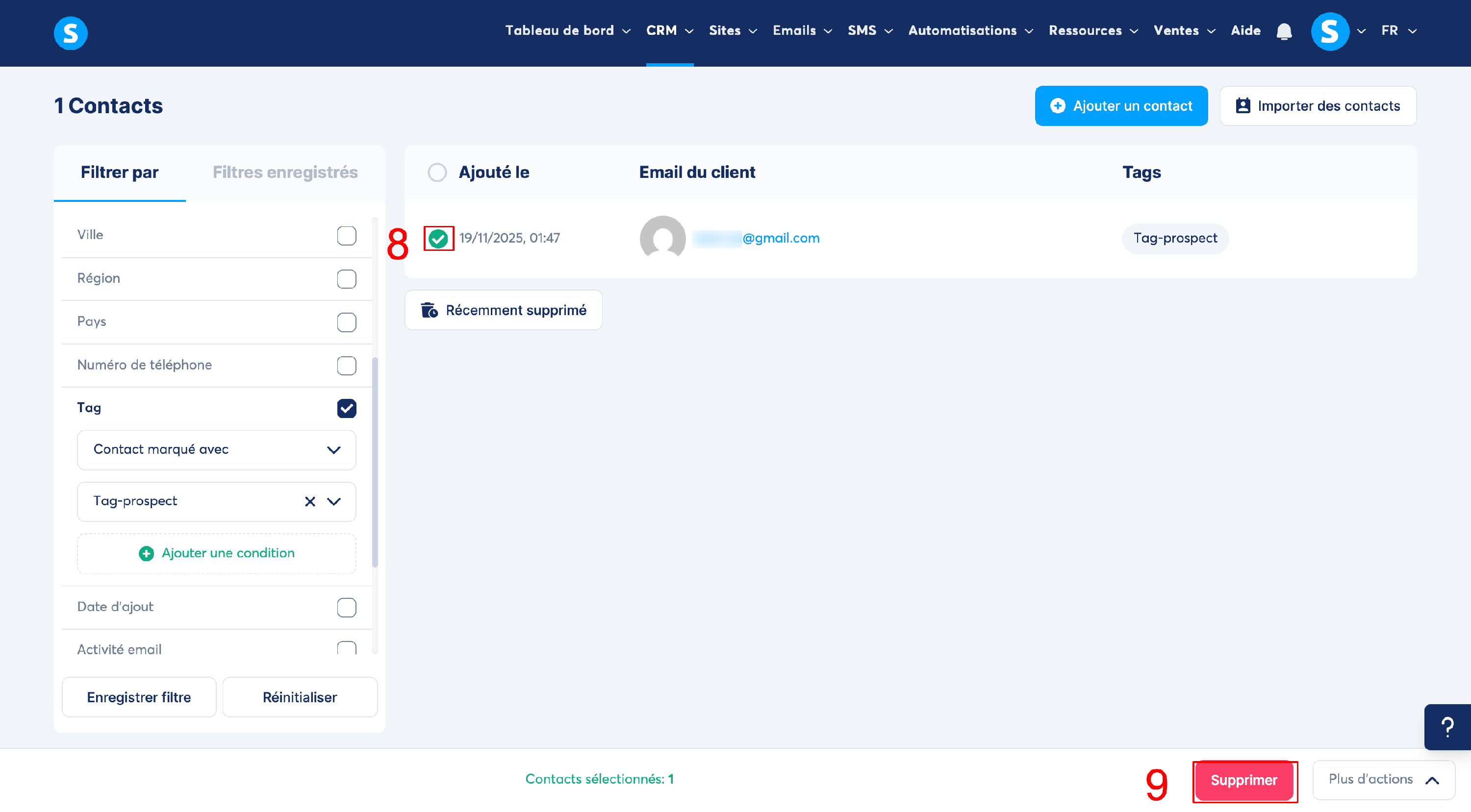 La liste des contacts qui ont le tag "Tag-prospect" s'affiche. Ensuite, cliquez sur le bouton (numéro 8 sur l'image) pour sélectionner toute cette liste, puis cliquez sur "Supprimer". (numéro 9 sur l'image)