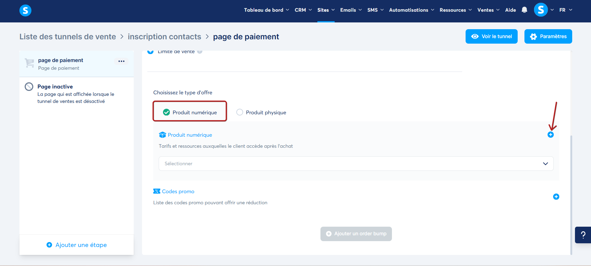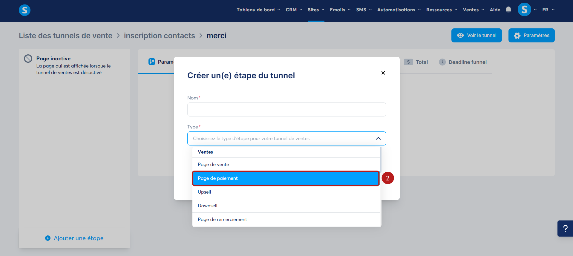 Rendez-vous dans le tunnel de vente où vous souhaitez ajouter la page. Dans le menu à gauche, cliquez sur "Ajouter une étape" (1).