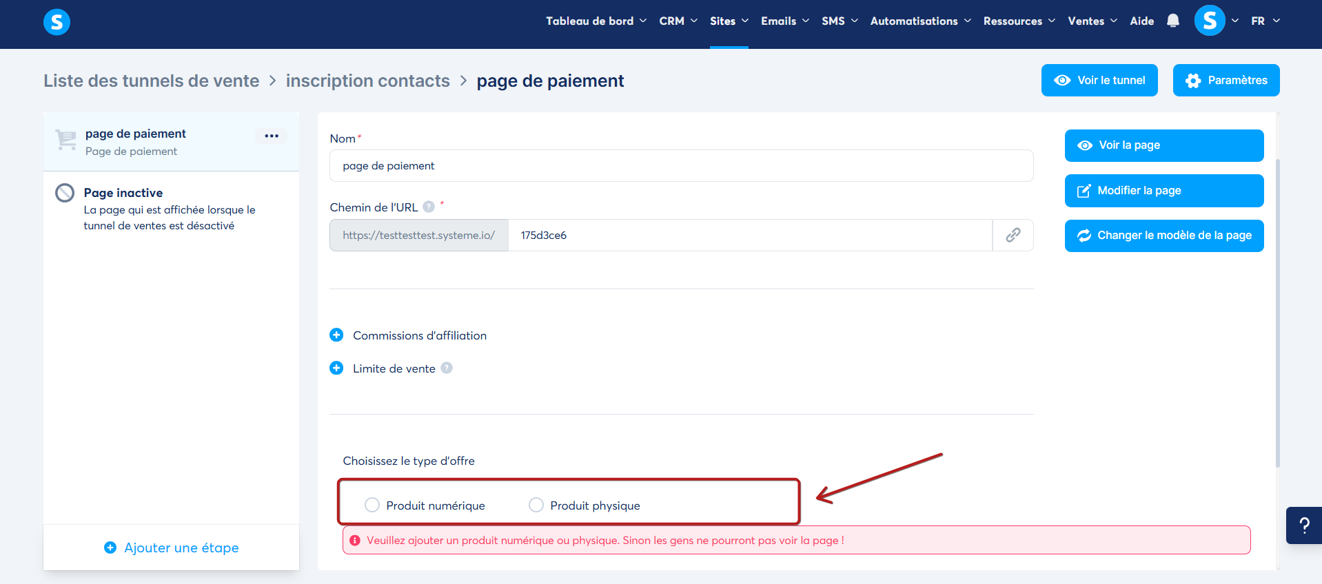 Donnez un nom à votre page, puis sélectionnez "Page de paiement" dans la liste des types (2).