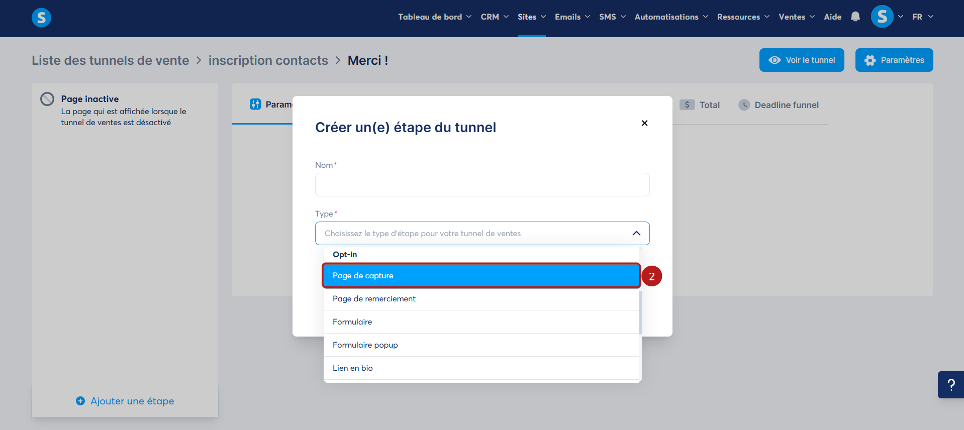 Donnez un nom à votre page, puis sélectionnez "Page de capture" dans la liste des types (2).