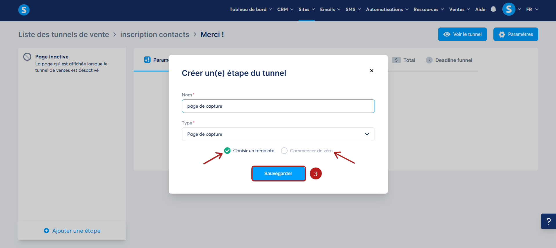 Vous pouvez choisir un modèle prédéfini ou partir d'une page vierge. Cliquez ensuite sur "Sauvegarder" (3).