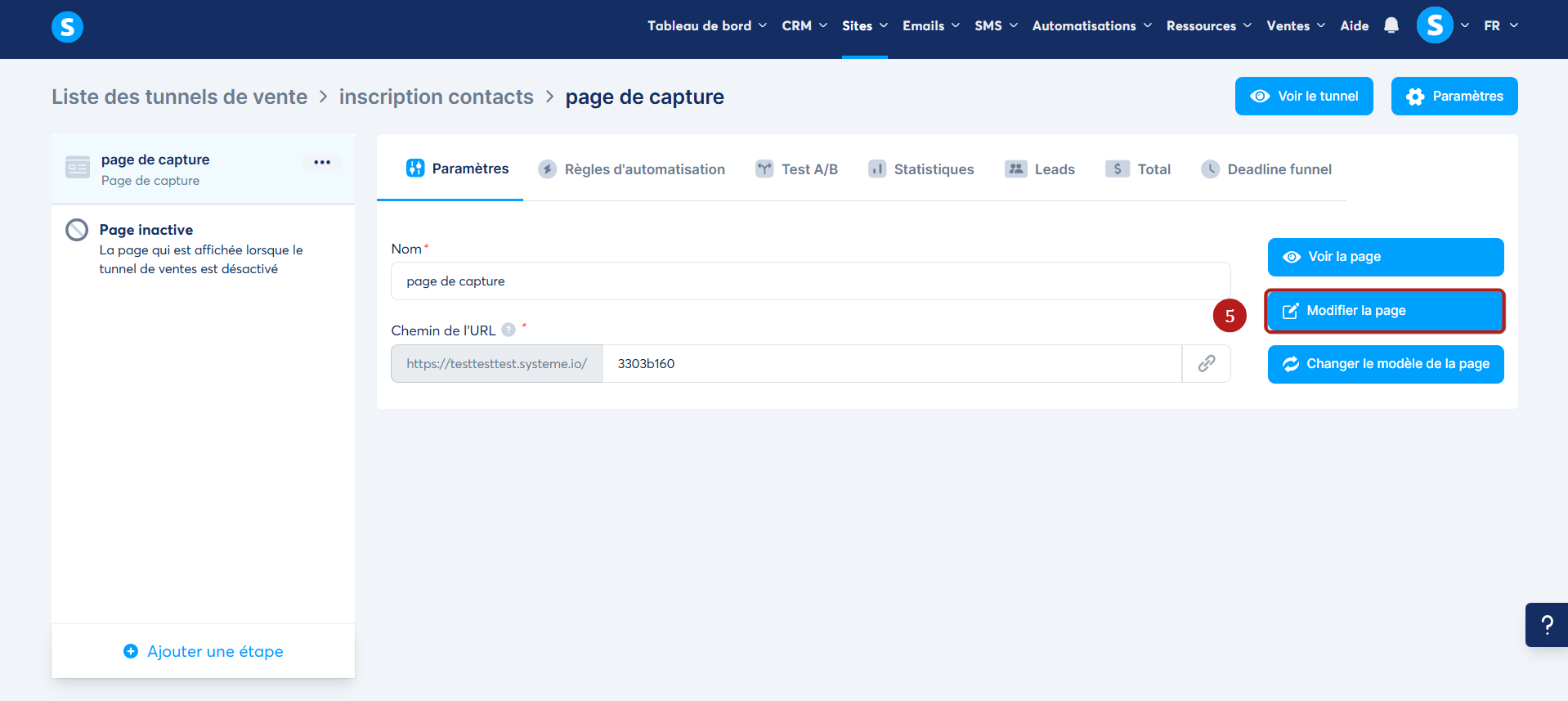 Une fois le modèle choisi, accédez à l'éditeur en cliquant sur l'icône "Modifier la page" (5) pour commencer à personnaliser votre page de capture.
