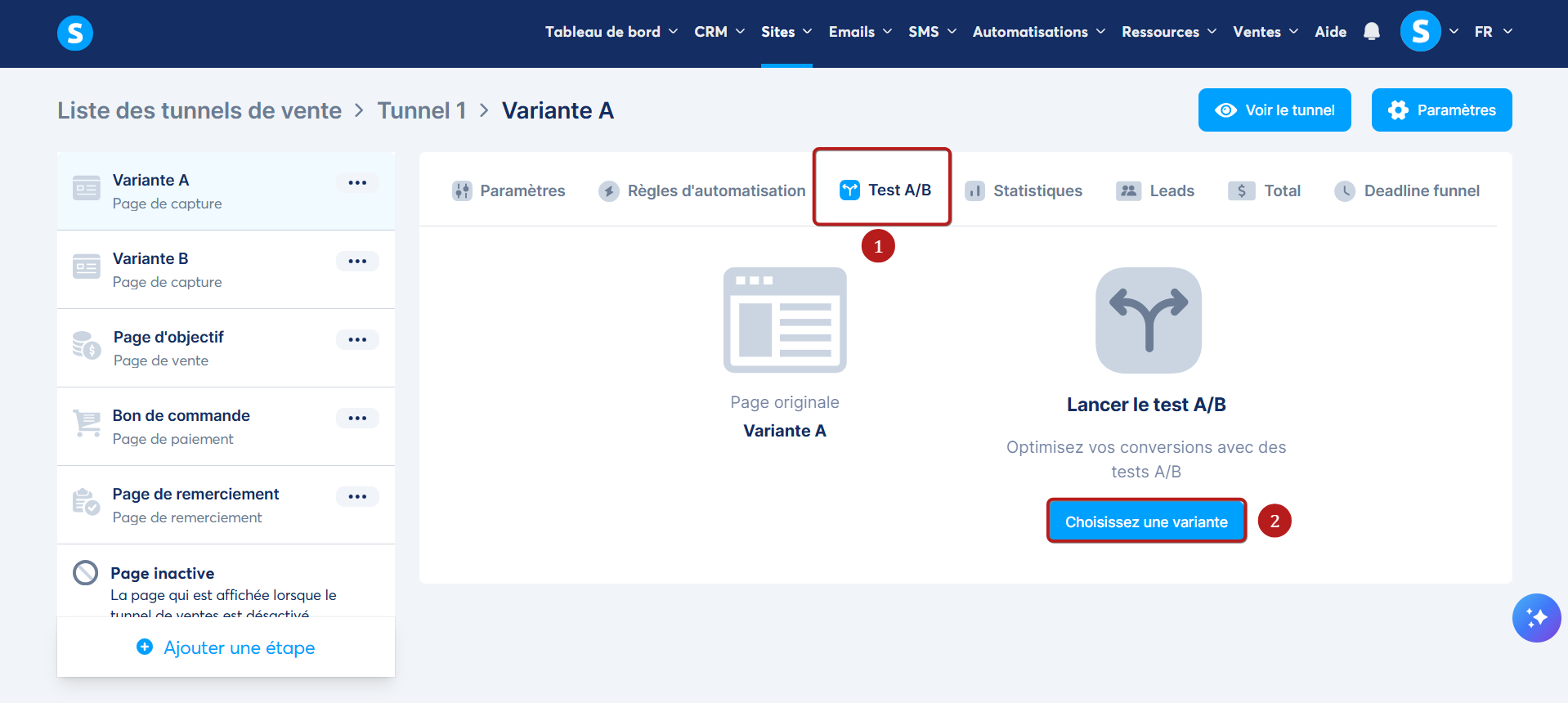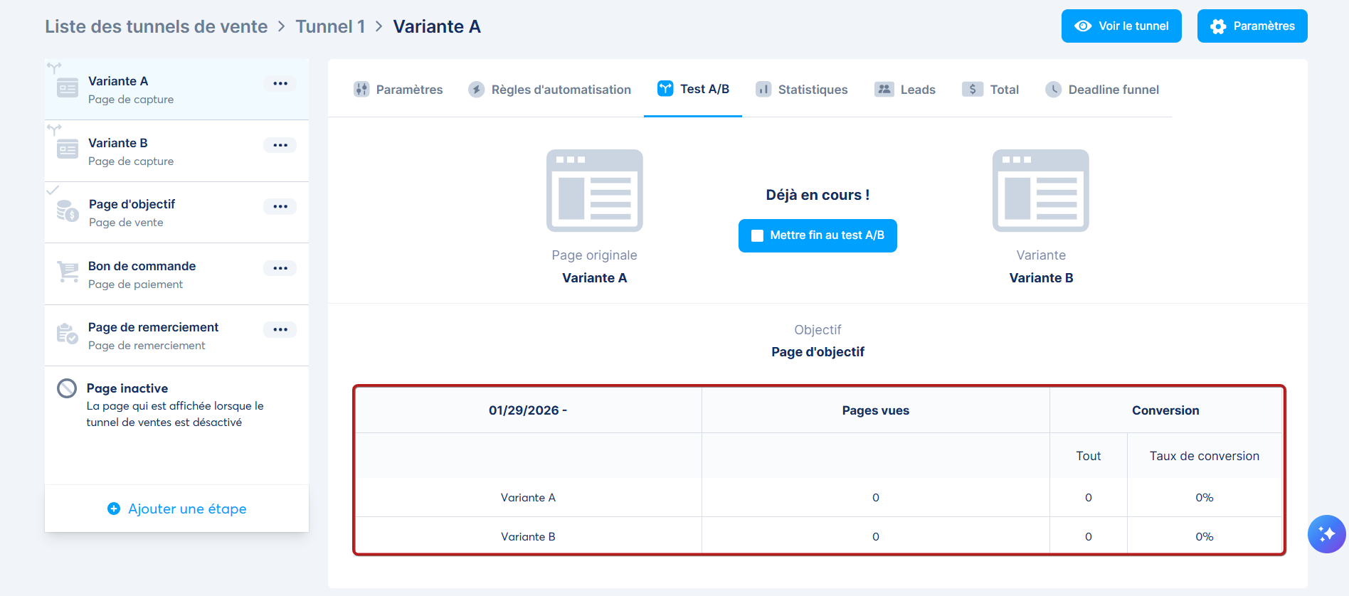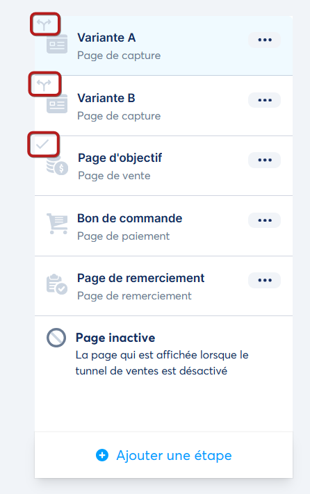 Pour créer un test A/B entre deux pages "Variante A" et "Variante B", les deux pages doivent être des pages créées dans le même tunnel de vente.