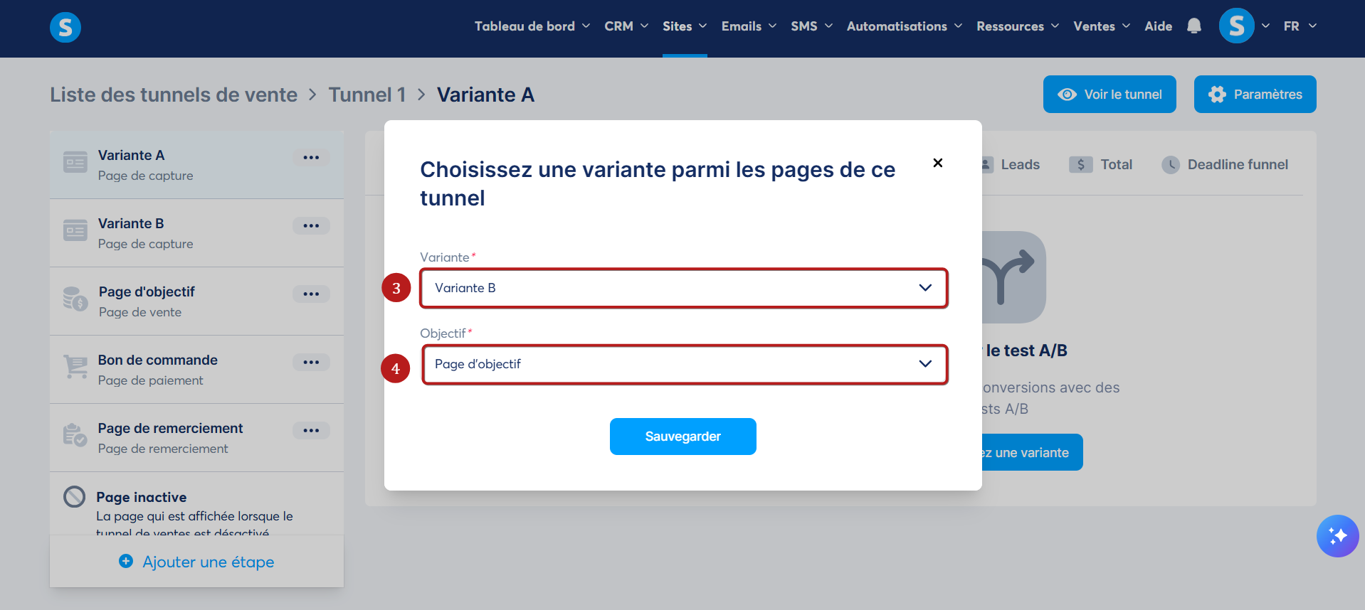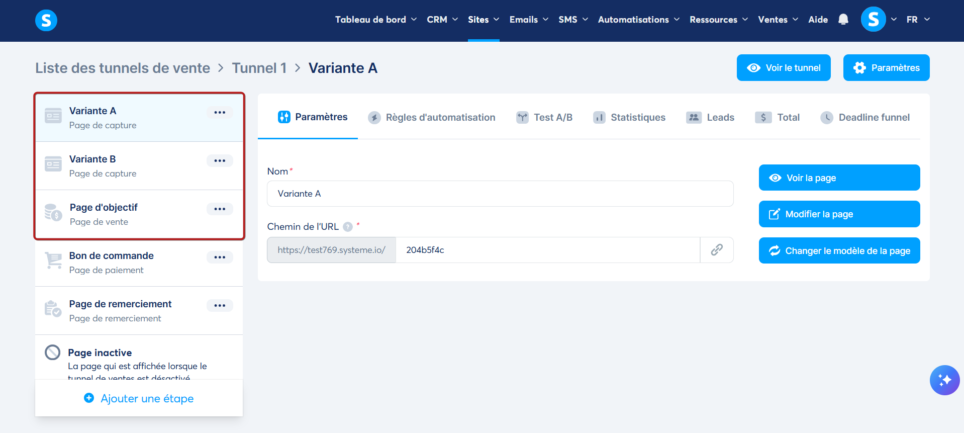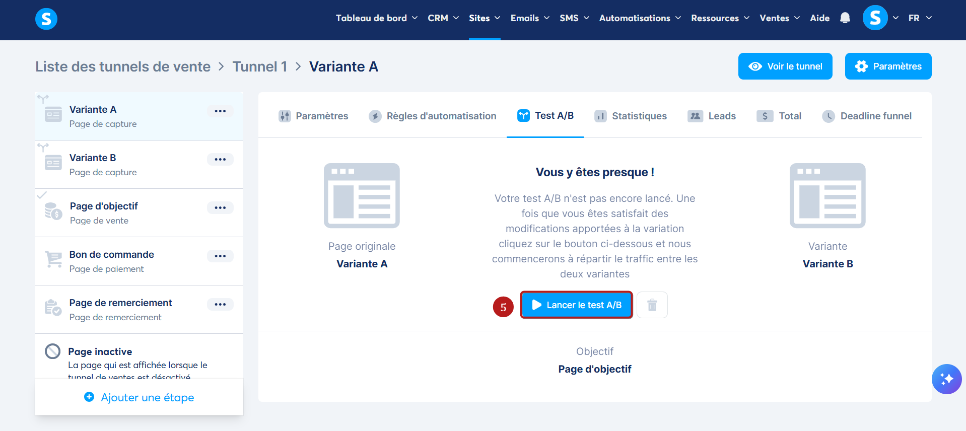 Pour créer un test A/B entre deux pages "Variante A" et "Variante B", les deux pages doivent être des pages créées dans le même tunnel de vente.