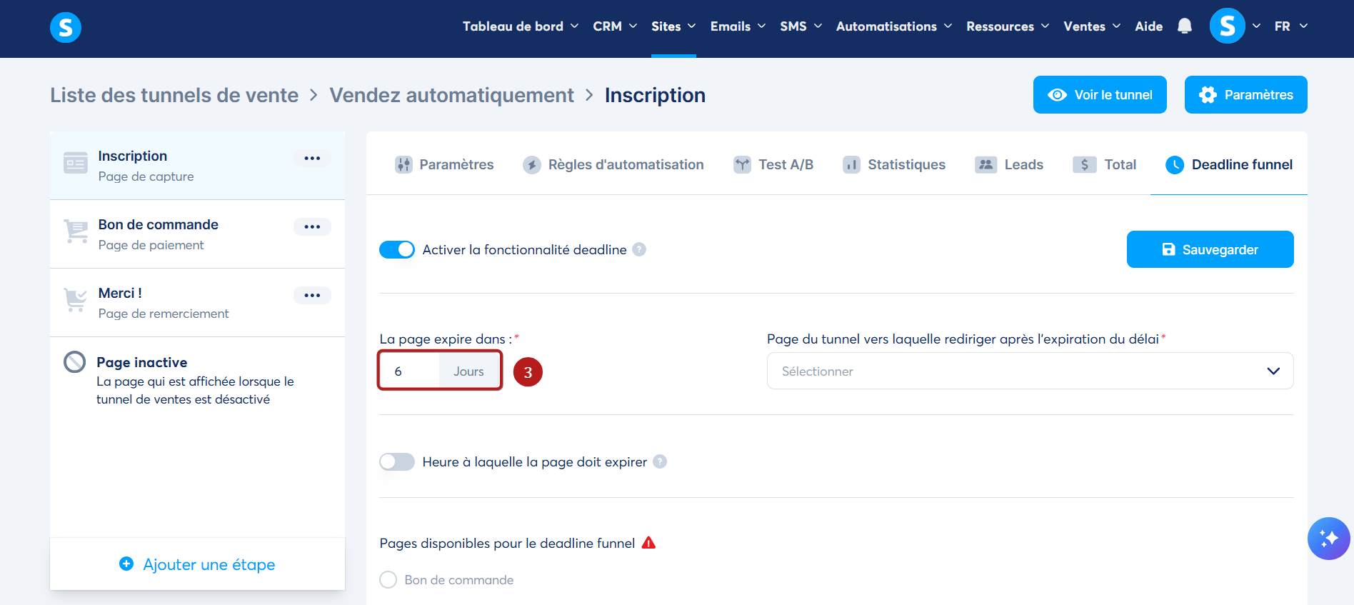 Après avoir créé un tunnel de vente, vous pouvez paramétrer une deadline en suivant les étapes suivantes :