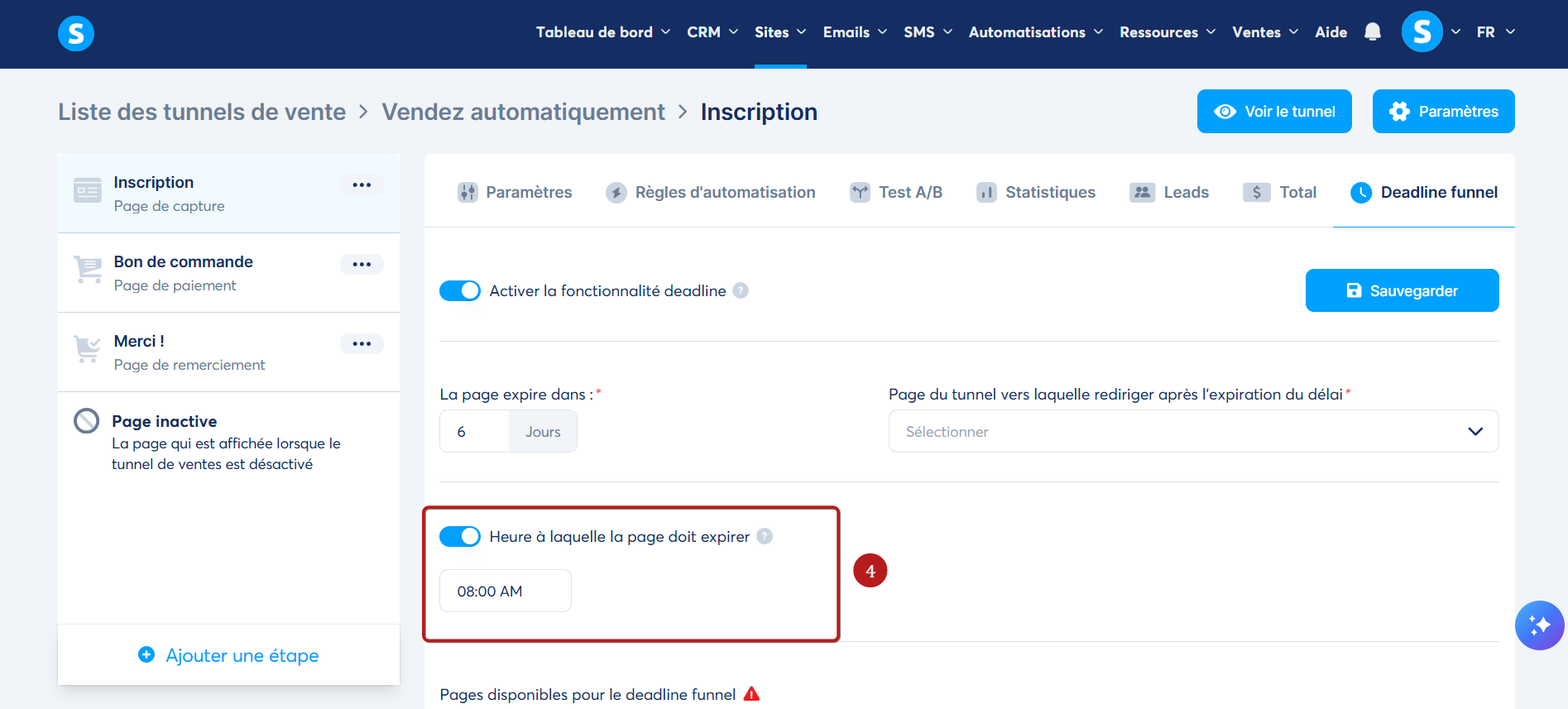 6. Enfin, il vous faut choisir la/les page(s) auxquelles vous souhaitez attribuer une deadline en cochant simplement la/les case(s) correspondante(s) dans la partie "Pages disponibles pour le deadline funnel" (6).