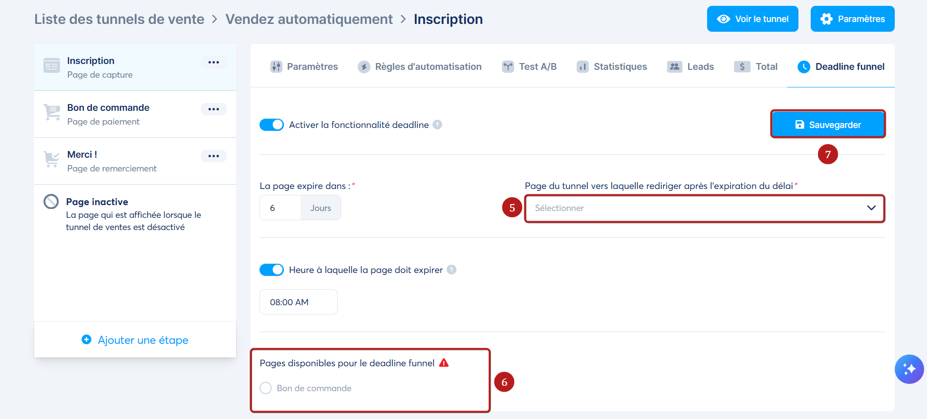 5. Vous devez choisir la page à laquelle vous souhaitez rediriger vos prospects après l'expiration de la deadline dans la case "Page du tunnel vers laquelle rediriger après l'expiration du délai" (5).