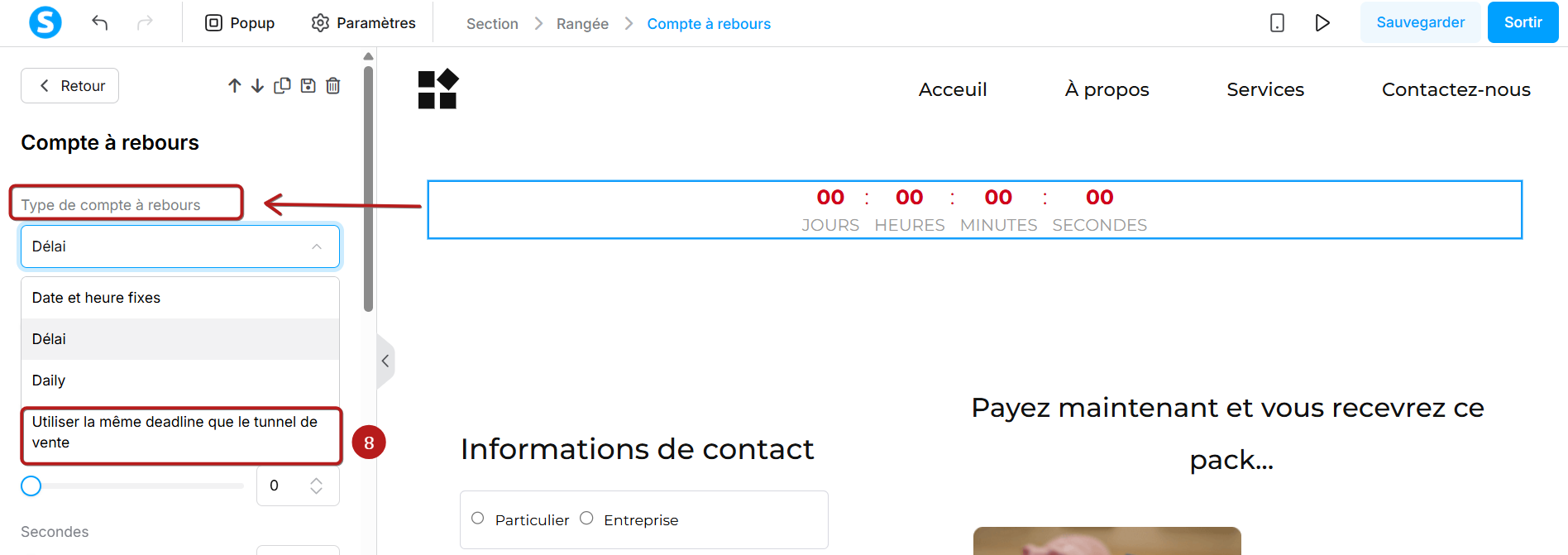 Si vous utilisez un compte à rebours dans votre tunnel de vente, vous pouvez choisir l'option « utiliser la même deadline que le tunnel de vente » dans l'éditeur de la page (8). Les deux fonctionnalités se synchroniseront automatiquement.