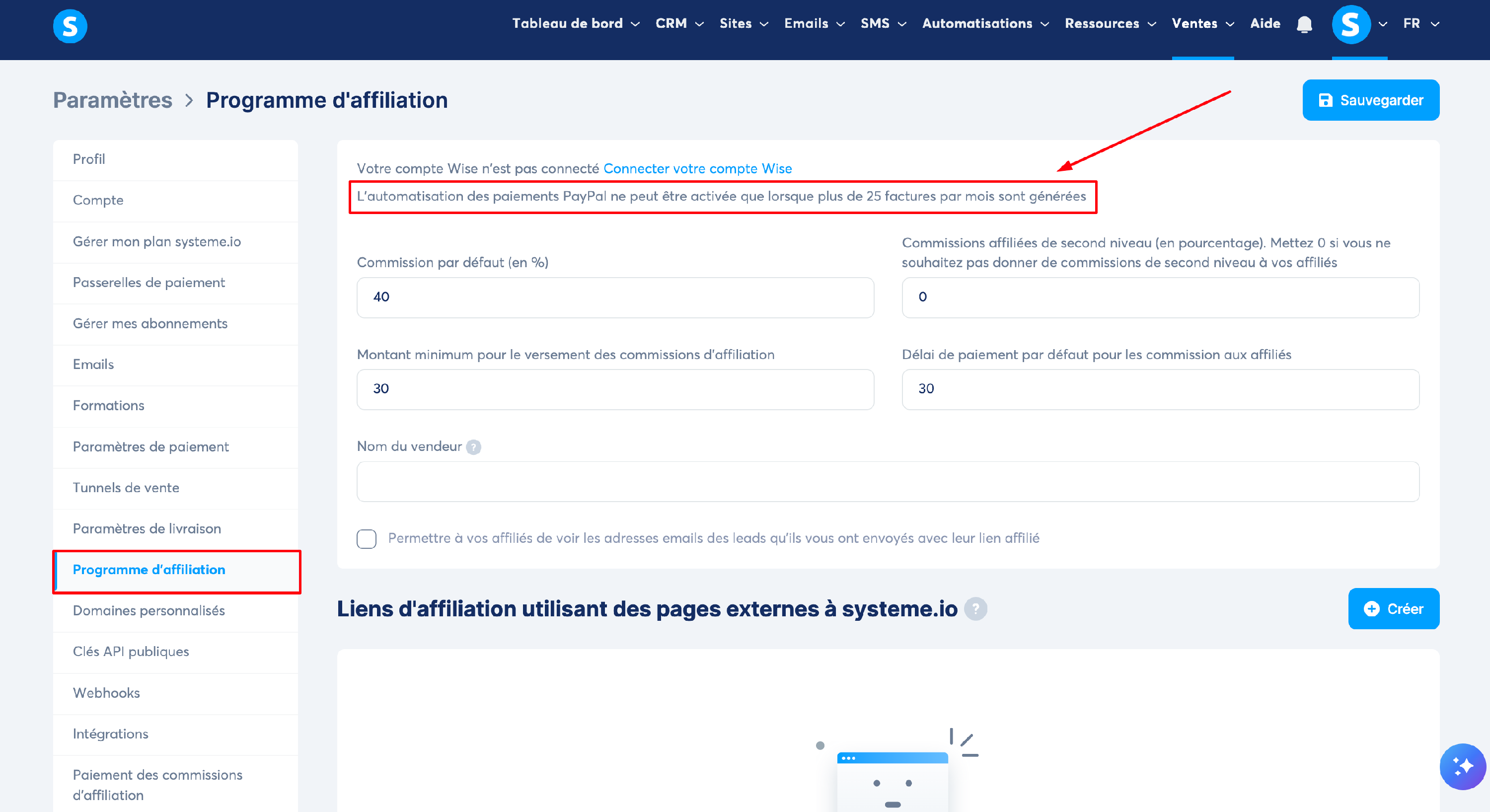 Une fois, vous avez plus de 25 factures d'affiliés en attente de paiement, connectez votre propre compte PayPal à systeme.io pour activer les paiements automatiques :