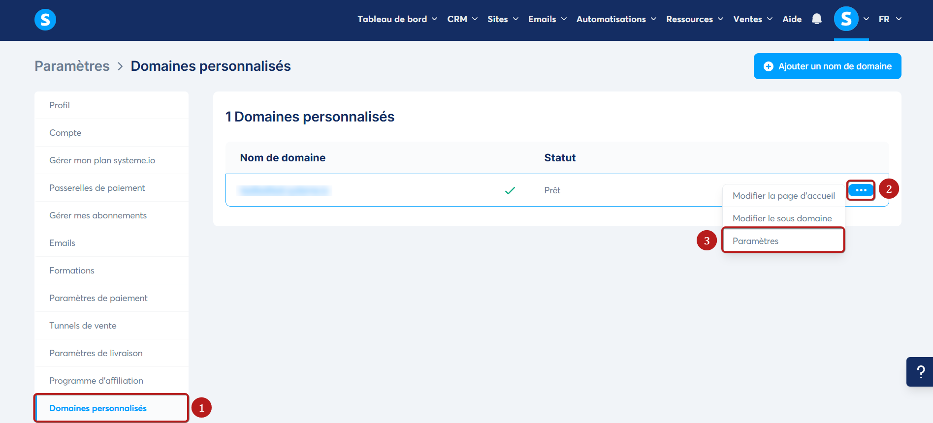 Pour commencer, vous devez vous rendre dans les paramètres des Domaines personnalisés (1), ensuite cliquer sur l'icône des trois points (2), enfin sur "paramètres" (3).