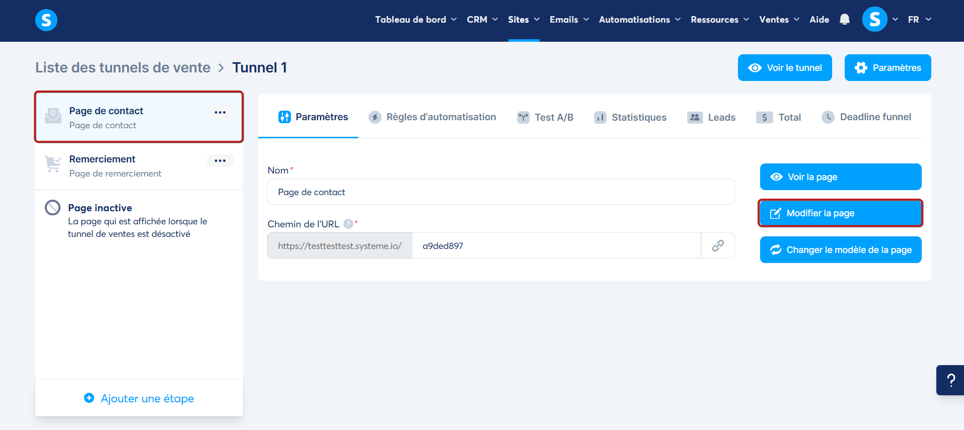 -Sélectionnez le tunnel contenant la page de contact.