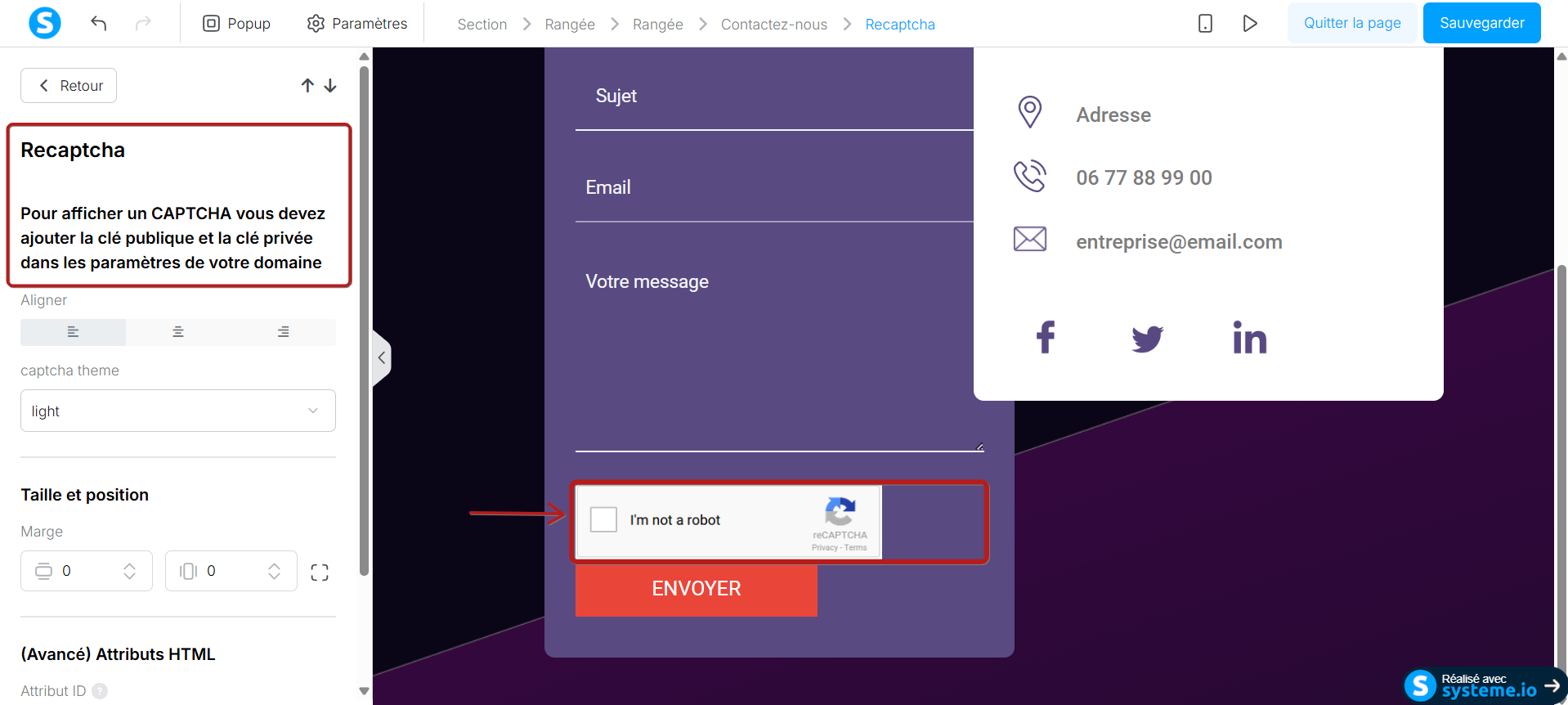 Maintenant que vous avez obtenu vos clés reCAPTCHA, vous allez pouvoir les intégrer dans votre page de contact créée via systeme.io.
