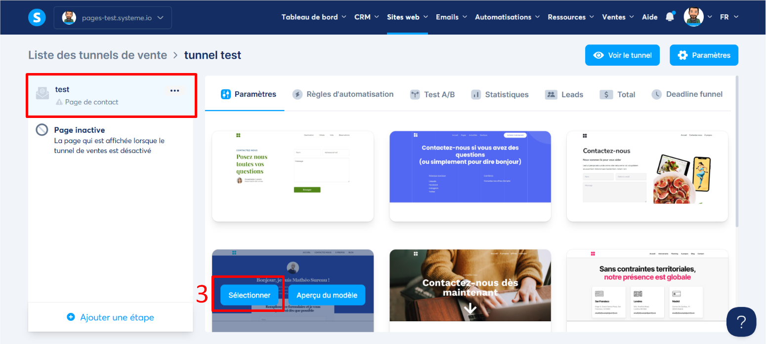 Vous devez ensuite choisir parmi les templates existant en cliquant sur "Sélectionner". (numéro 3 sur l'image)