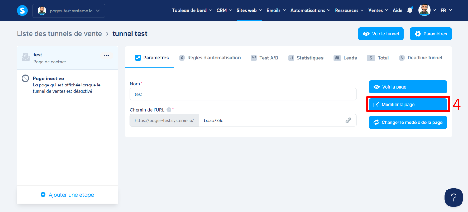 Entrez dans l'éditeur de votre page en cliquant sur le bouton "Modifier la page" pour personnaliser votre page. (numéro 4 sur l'image)