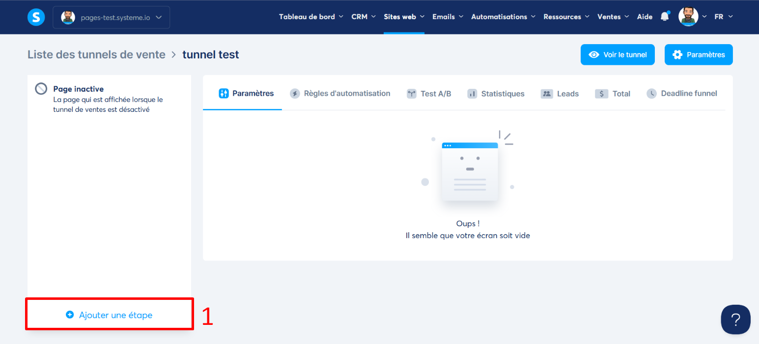 Veuillez vous rendre sur le tunnel de vente sur lequel vous souhaitez ajouter une page de contact, redirigez-vous sur le volet gauche du menu des pages de votre tunnel de vente, puis cliquez sur "Ajouter une étape". (numéro 1 sur l'image)