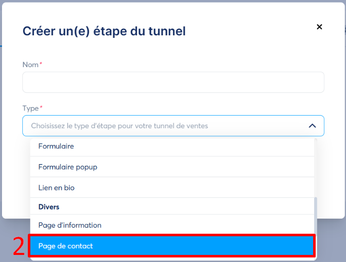 Puis choisissez le type de page "Page de contact" comme type d'étape. (numéro 2 sur l'image)