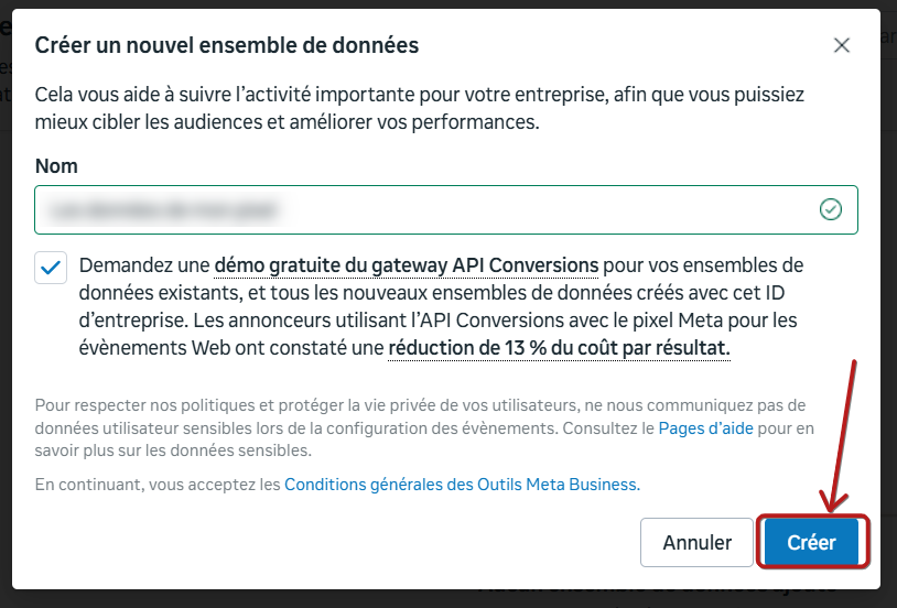 Une fois que vous avez saisi un nom pour votre pixel, vous pouvez cliquer sur "Créer".