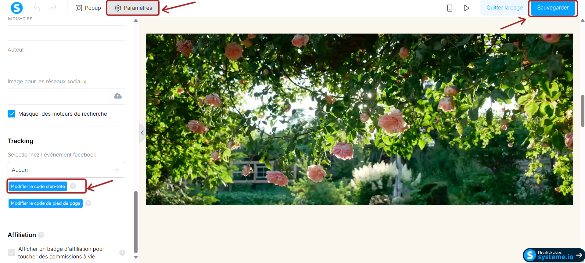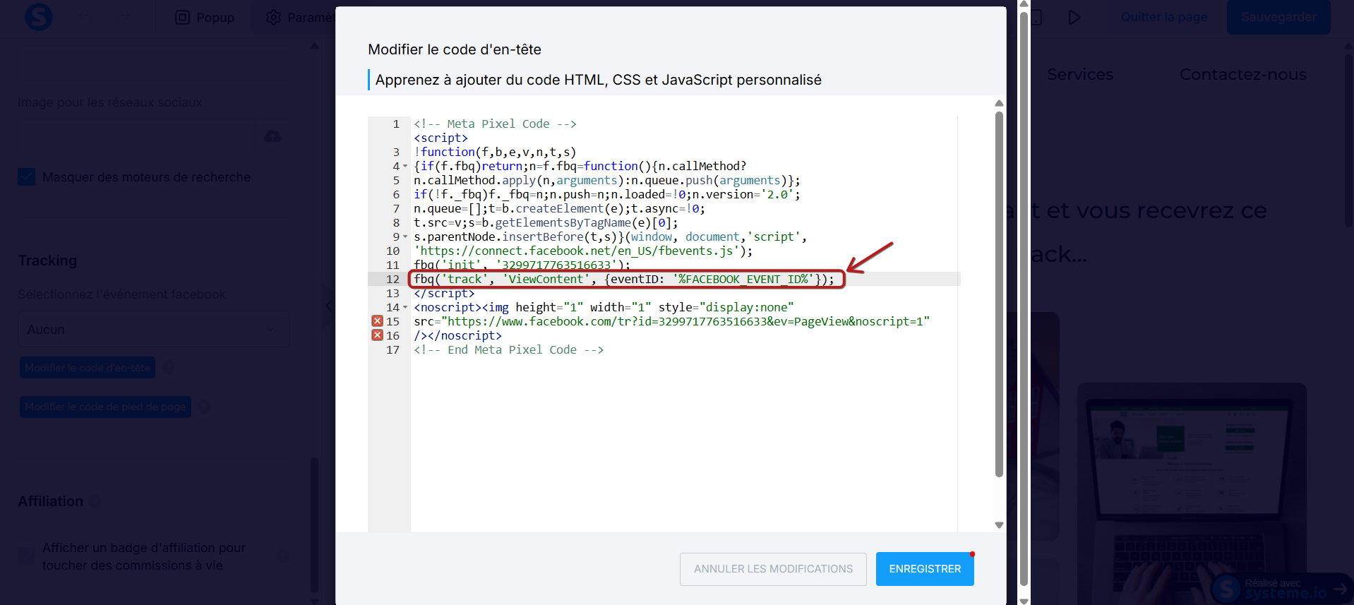 Vous devez aller sur l'éditeur de votre page, puis cliquez sur "Paramètres" au niveau du volet gauche sur l'éditeur, ensuite, vous devez coller le pixel Facebook dans la case "Modifier le code d'en-tête" des codes de tracking.