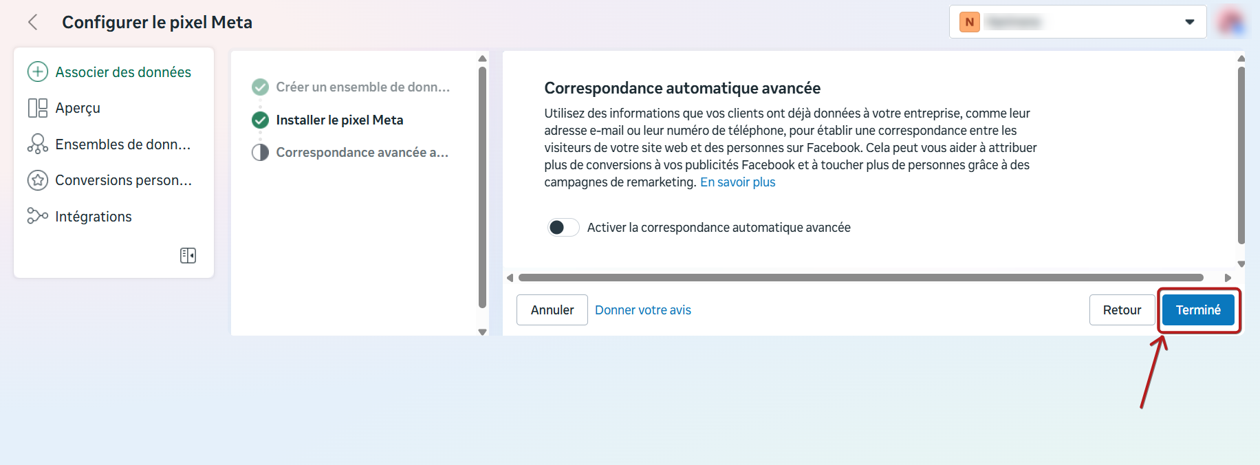 Maintenant que vous avez ajouté manuellement les événements au "Meta Pixel code", vous pouvez cliquer sur "Continuer" du côté de votre compte professionnel Facebook.