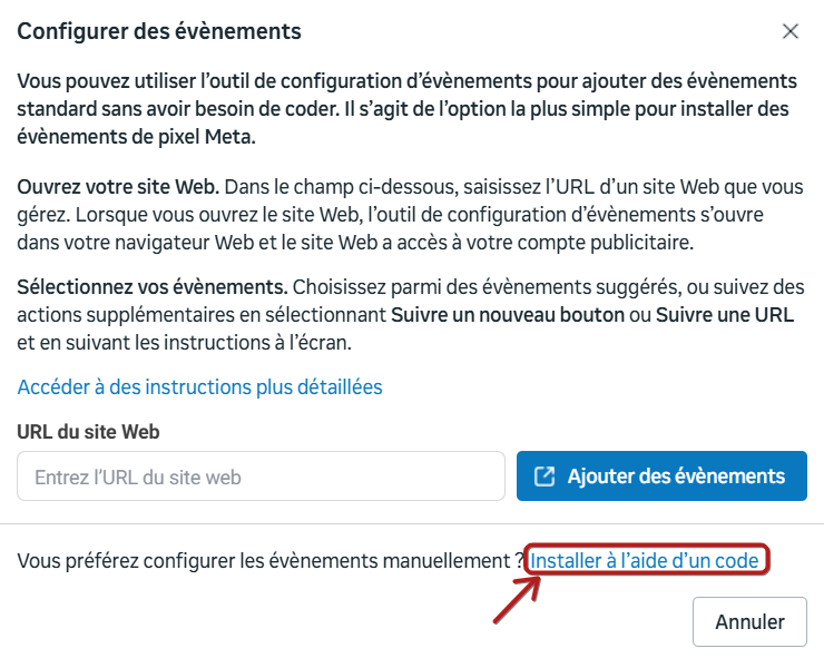 L'outil de configuration des événements ne fonctionne pas toujours et, dans cet exemple, nous ajouterons manuellement le code de l'événement au "Meta Pixel code".