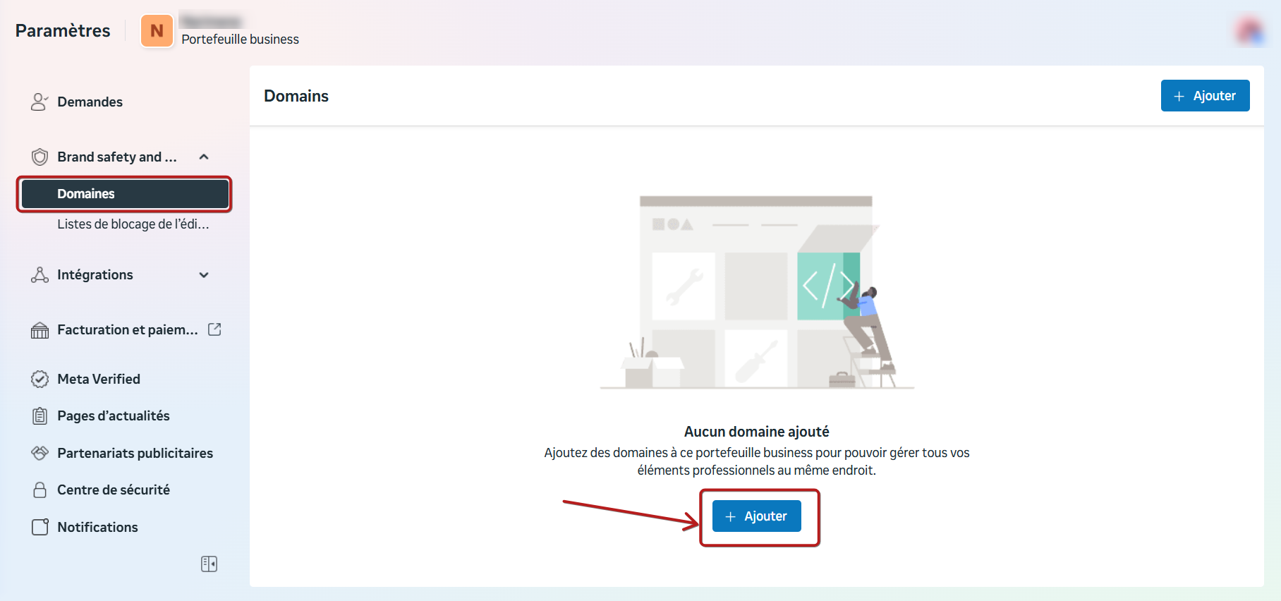 2.7 Vous devez à présent vérifier votre domaine, continuez en cliquant sur "Domaine". Cliquez ensuite sur "Ajouter".