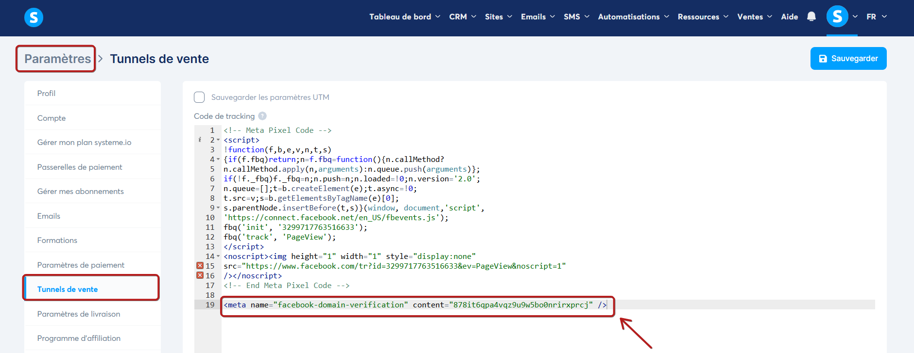 Vous recevrez un "Meta-tag" qui doit être ajouté au "Code d'en-tête" de votre page ou dans les paramètres des "Tunnels de vente" sous le "Meta Pixel code" (vous devez laisser un espace entre les deux codes).