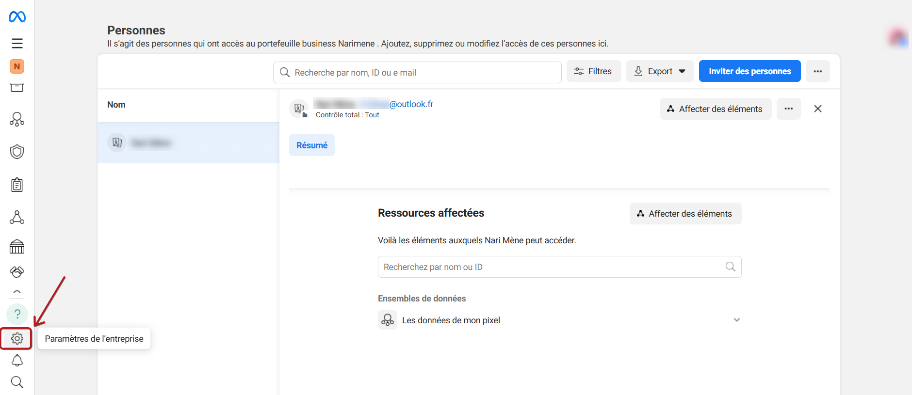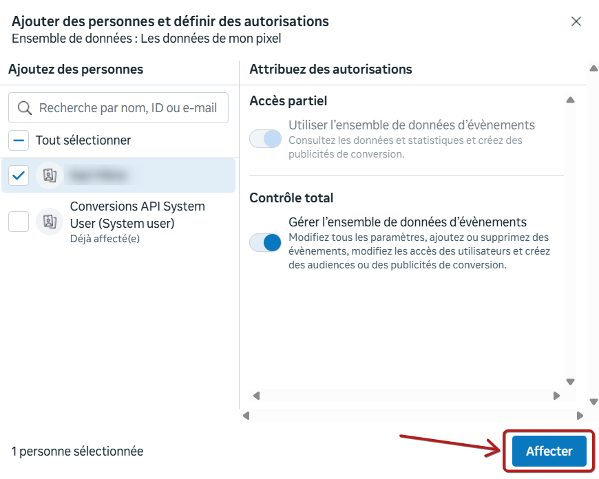 Une autre fenêtre contextuelle s'affiche, dans laquelle il vous suffit de cocher le compte d'annonces, puis de cliquer sur "Affecter des éléments".