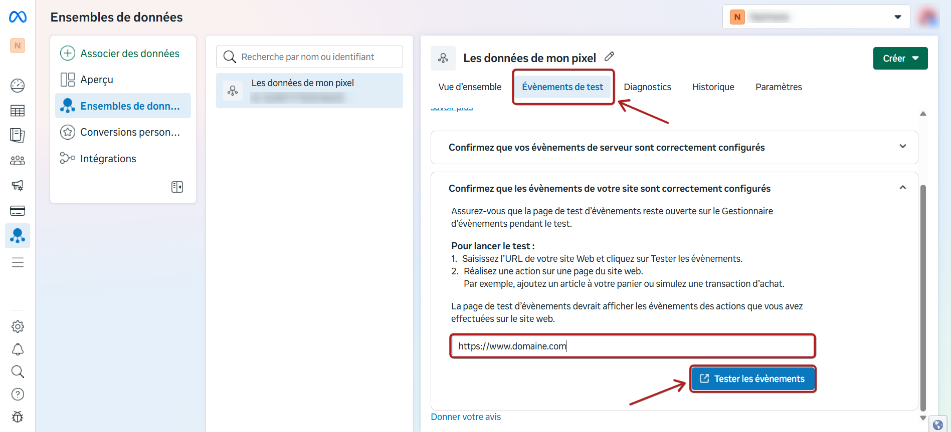 Cliquez sur "Événements de test", entrez l'URL de votre site Web dans le champ situé sous "Entrer l'URL du site web" et cliquez sur "Tester les événements".