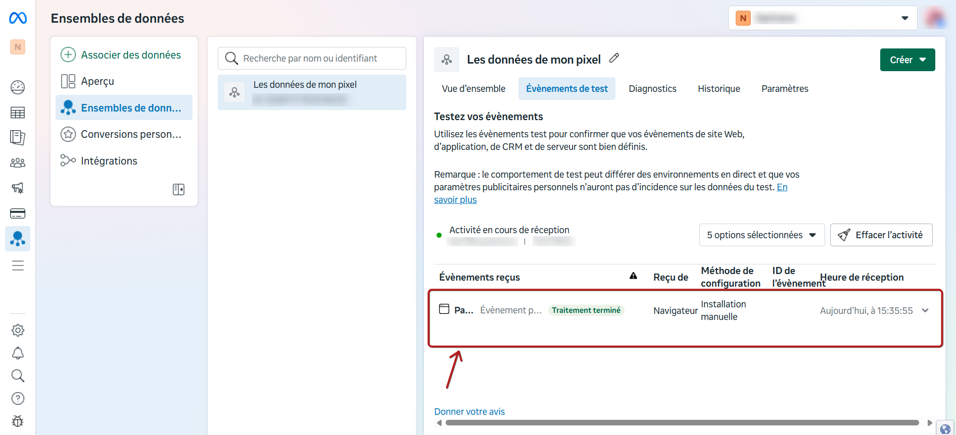 - Les événements CAPI et Pixel peuvent ensuite être consultés dans le Gestionnaire d'Événements Meta pour confirmer qu'ils sont suivis correctement et que la déduplication fonctionne comme prévu.