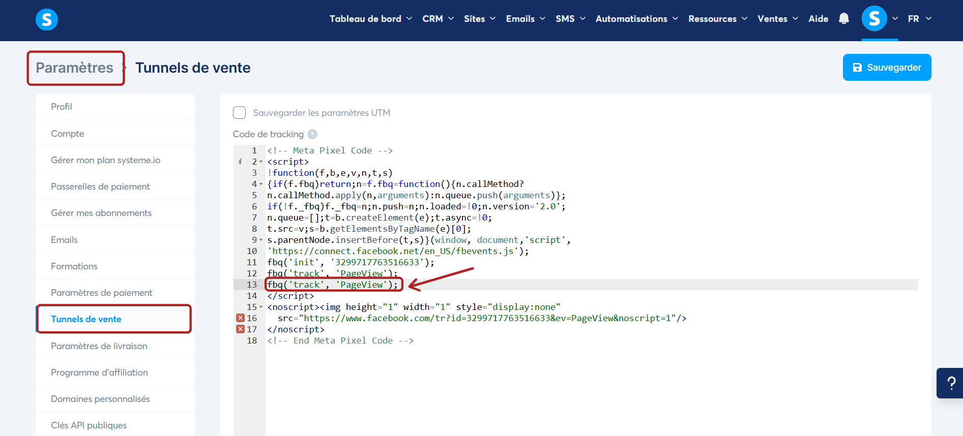 - Dans le Pixel, vous devez ajouter cet identifiant manuellement dans le code de suivi, à l’aide des placeholders prévus par systeme.io.