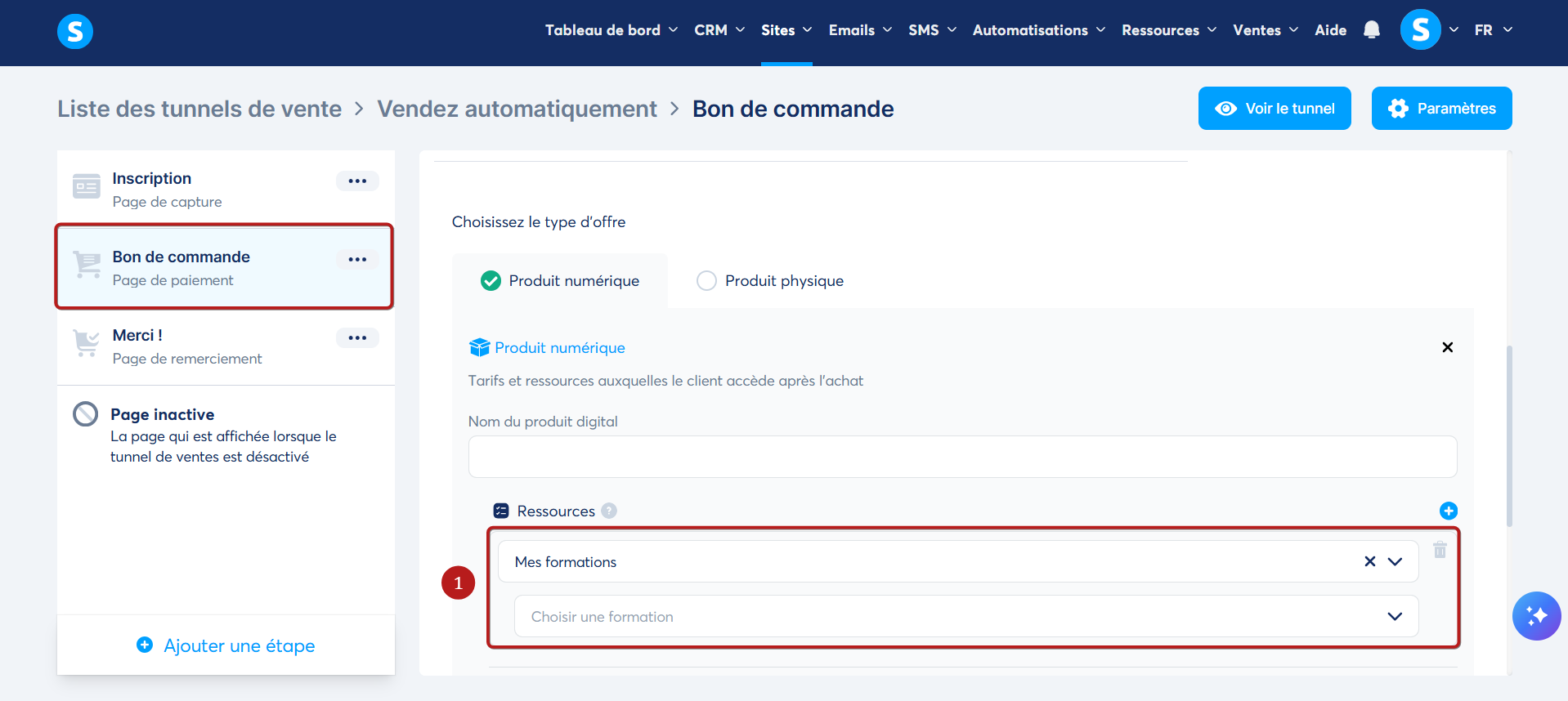 Pour pouvoir donner accès à une formation de manière automatique après l'achat d'un client sur votre page de paiement, il vous suffit de configurer l'ajout à la formation au niveau de la ressource de la page de paiement de votre tunnel de vente (1).